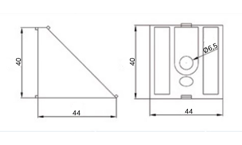 45° Winkel zum Verbinden von Profilen. Abmessungen 40 x 44 x 44 mm.