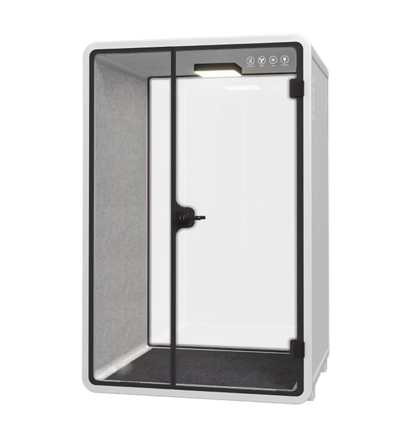 Der Akustik-Box ist ein schallgedämpftes Büro für eine bis zwei Personen, das eine ruhige Umgebung für konzentriertes Arbeiten, Telefonieren und Videokonferenzen bietet. Die Grundlage des Boxes besteht aus einem stabilen Metallrahmen, in den Akustikpaneele eingesetzt sind, die Türen sind aus gehärtetem Glas, ein oberer Ventilator sorgt für eine effektive Luftzirkulation, eine optimale Beleuchtung mit einer Farbtemperatur von 4000 K, Steckdosen und USB-Anschlüsse. Der Raum kann mit einem Möbelset ausgestattet werden. Abmessungen: 2346 x 1500 x 1236 mm.