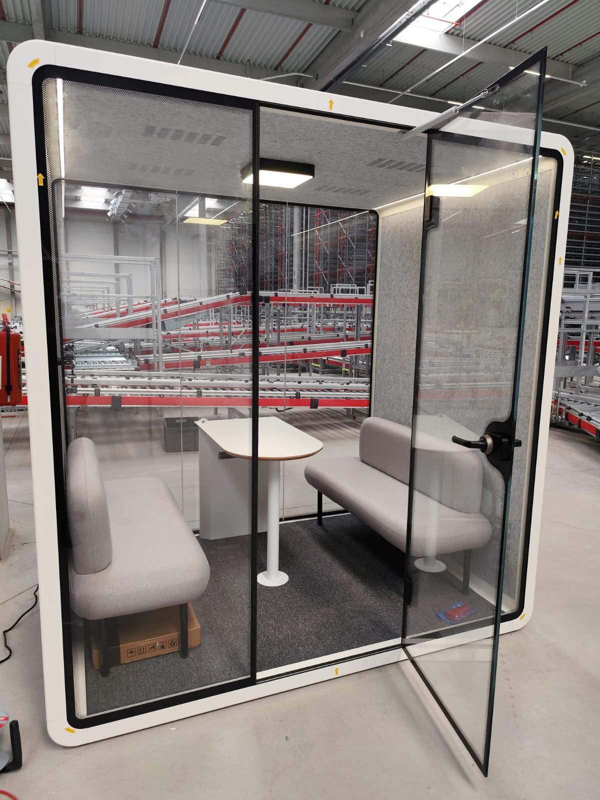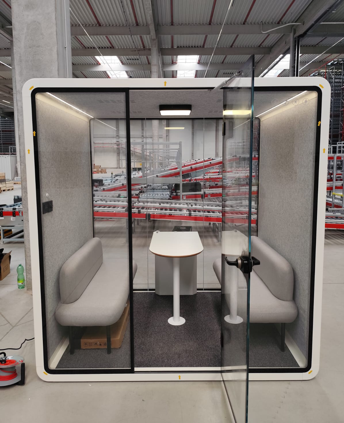 Der Akustik-Box ist ein Besprechungsraum für vier Personen, der eine ruhige Umgebung für konzentriertes Arbeiten, Telefonieren oder Meetings bietet. Die Grundlage des Boxes besteht aus einem stabilen Metallrahmen, in den Akustikpaneele eingesetzt sind, die Türen sind aus gehärtetem Glas, zwei obere Ventilatoren sorgen für eine effektive Luftzirkulation, optimales Licht mit einer Farbtemperatur von 4000 K, Steckdosen und USB-Anschlüsse. Der Raum kann mit einem Sofa, einem Tisch oder anderem Möbelstück ausgestattet werden. Abmessungen: 2346 x 2200 x 1536 mm.