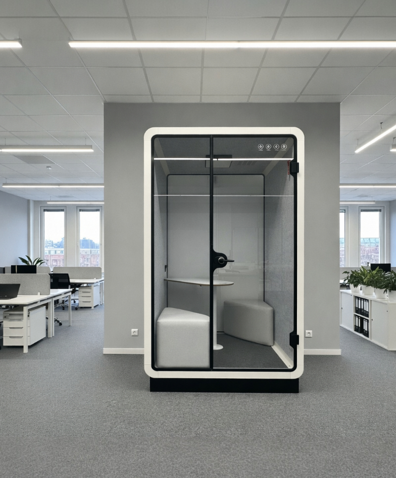 Der Akustik-Box ist ein schallgedämpftes Büro für eine bis zwei Personen, das eine ruhige Umgebung für konzentriertes Arbeiten, vollständige Beschreibung und Parameter