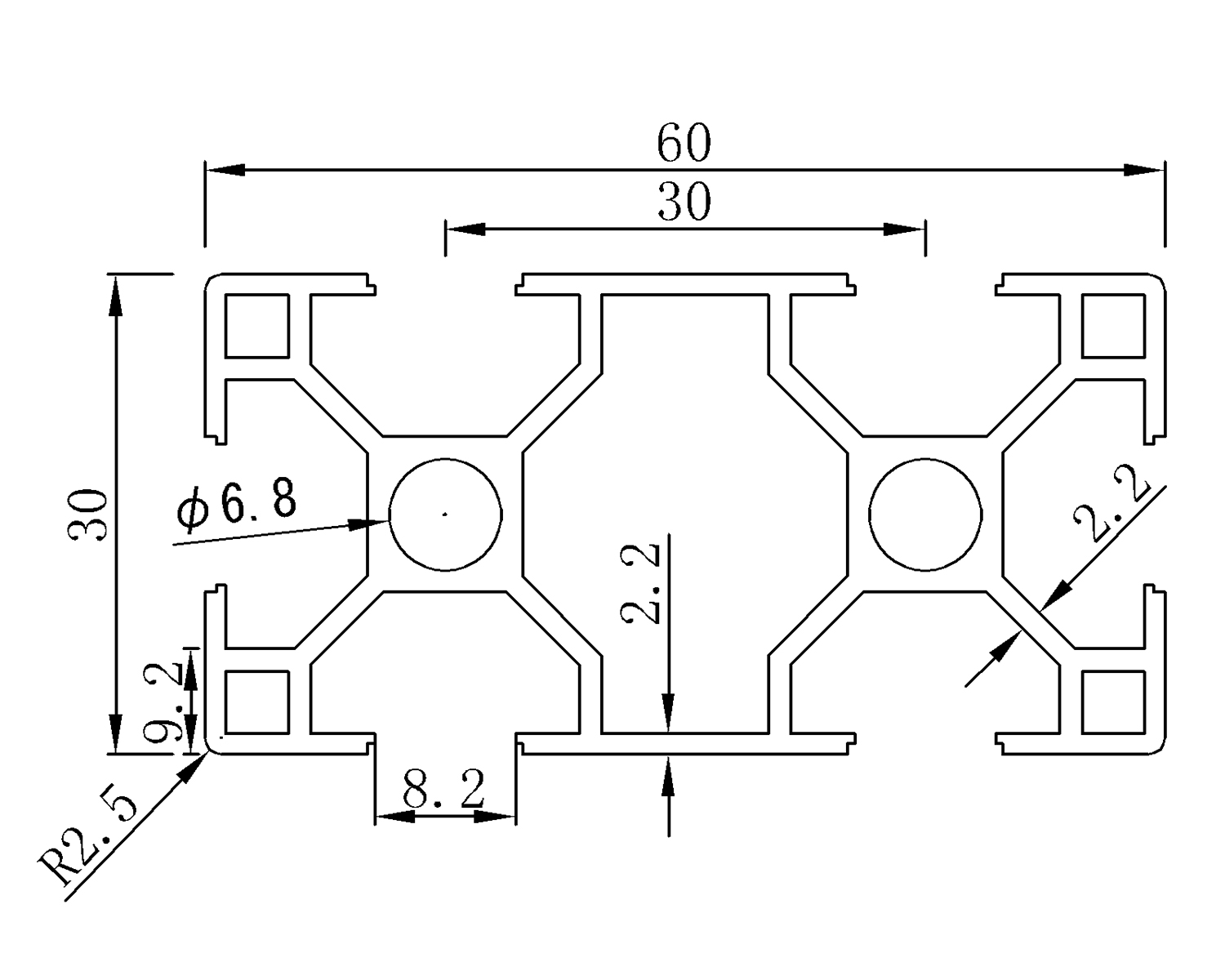 Aluprofil mit den Abmessungen 30 x 60 mm. Preis gilt für 1 m. Maximale Länge eines Profils beträgt 4 m. vollständige Beschreibung und Parameter