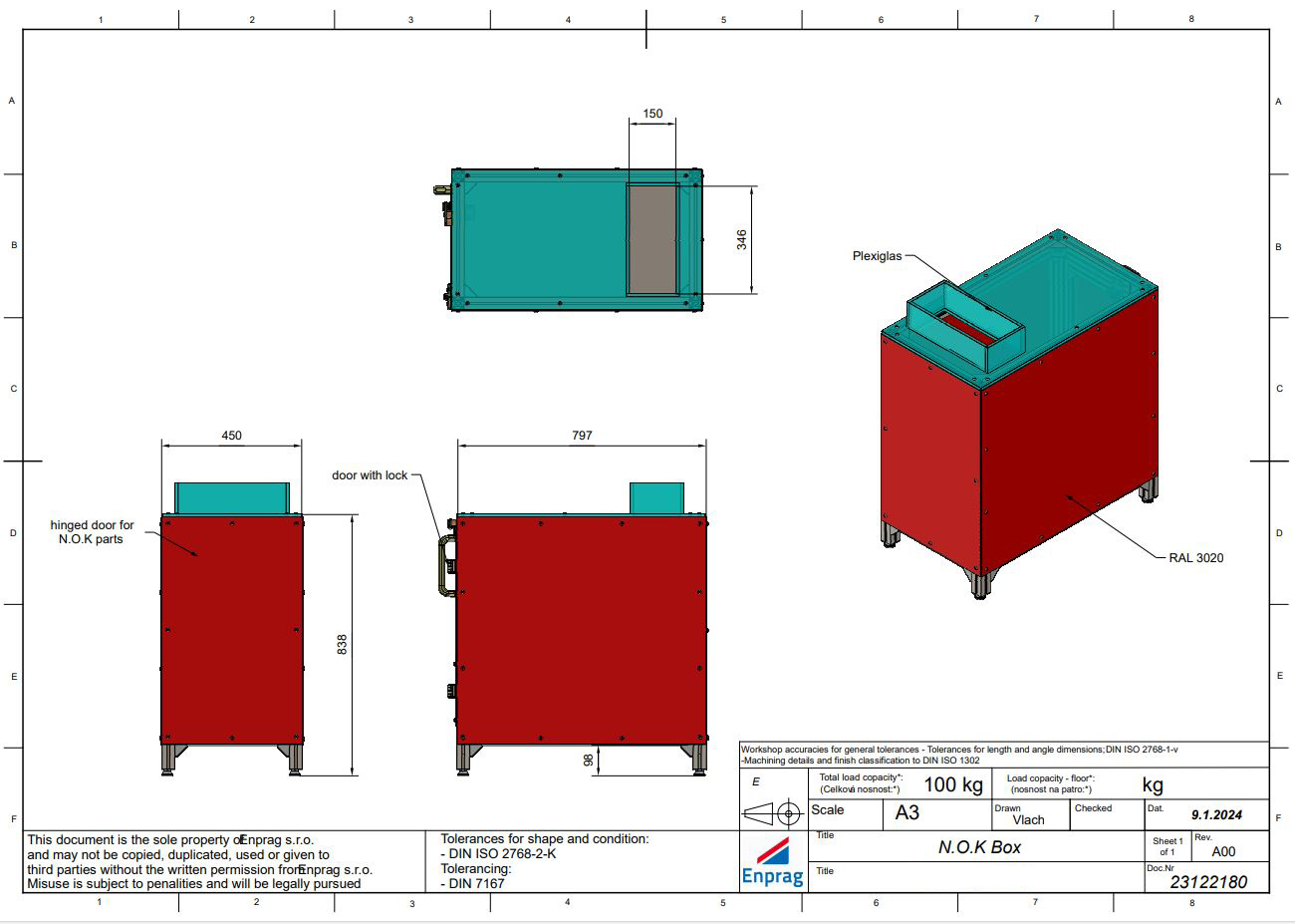 Eine Box, die für die Lagerung von NOK (Not Okay) Komponenten geeignet ist. Die robuste und hochwertige Konstruktion gewährleistet nicht nur sichere Aufbewahrung, sondern auch den sicheren Transport von NOK-Komponenten. Der obere Teil der Konstruktion besteht aus transparentem Plexiglas, das eine einfache Überwachung des Inhalts ermöglicht, und ist mit einer Öffnung versehen, um die Teile leicht hineinzuwerfen. Die Grundkonstruktion besteht aus Aluminiumprofilen.