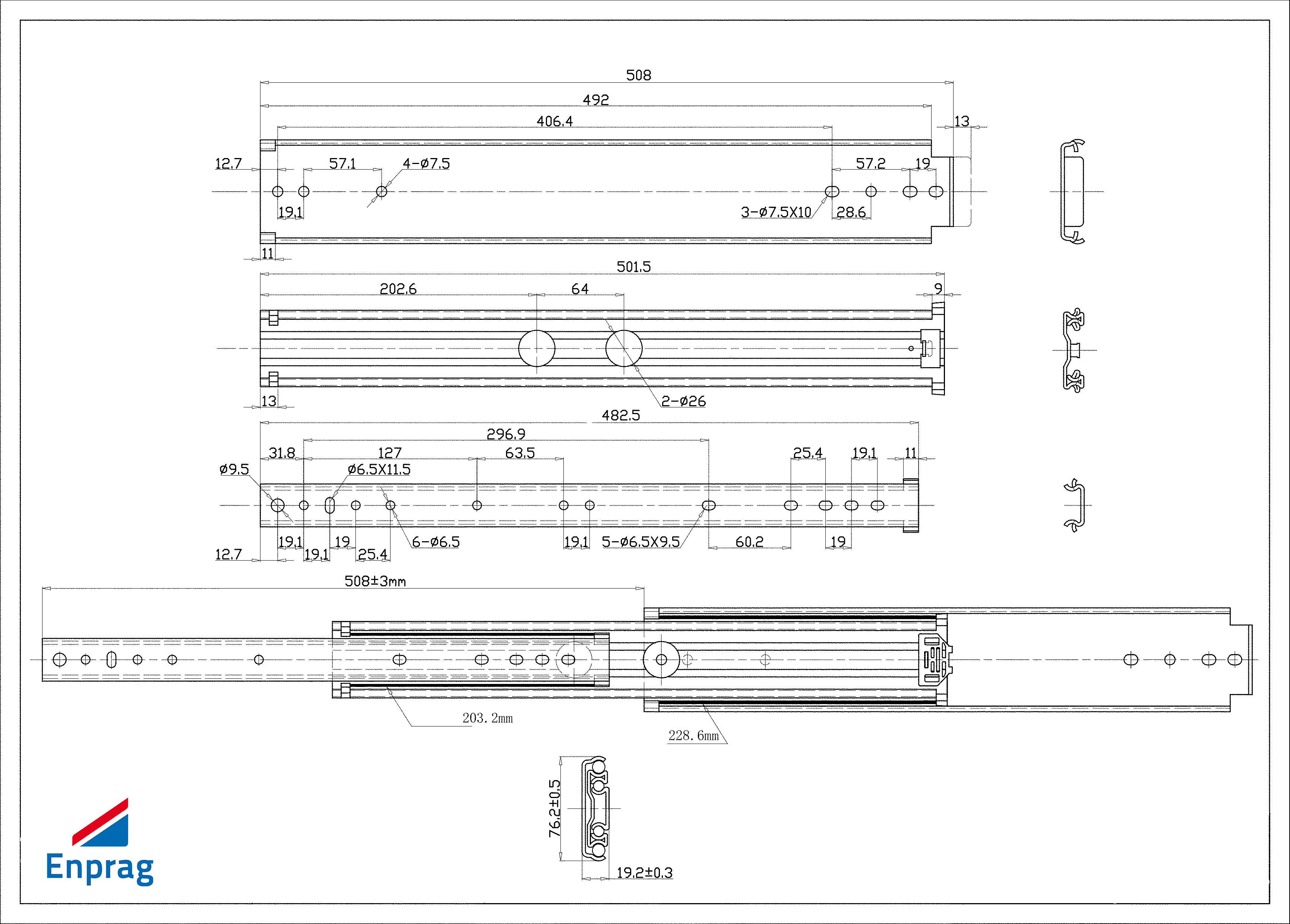 Kugelvollauszug, Länge 508 mm, ohne Dämpfung. Materialstärke 2,5 mm. Tragkraft 150 kg. vollständige Beschreibung und Parameter