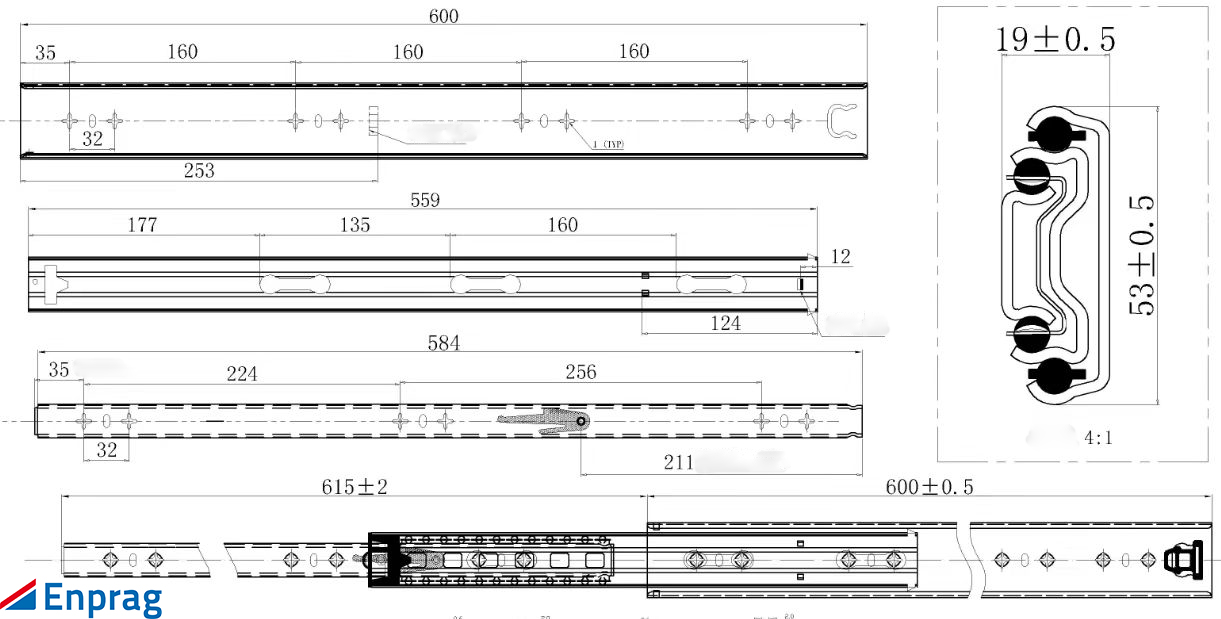 Kugelgelagertes Schubladen-Vollauszug, Länge 600 mm, ohne Dämpfung. Materialstärke 2 mm. Tragkraft 90 kg. vollständige Beschreibung und Parameter
