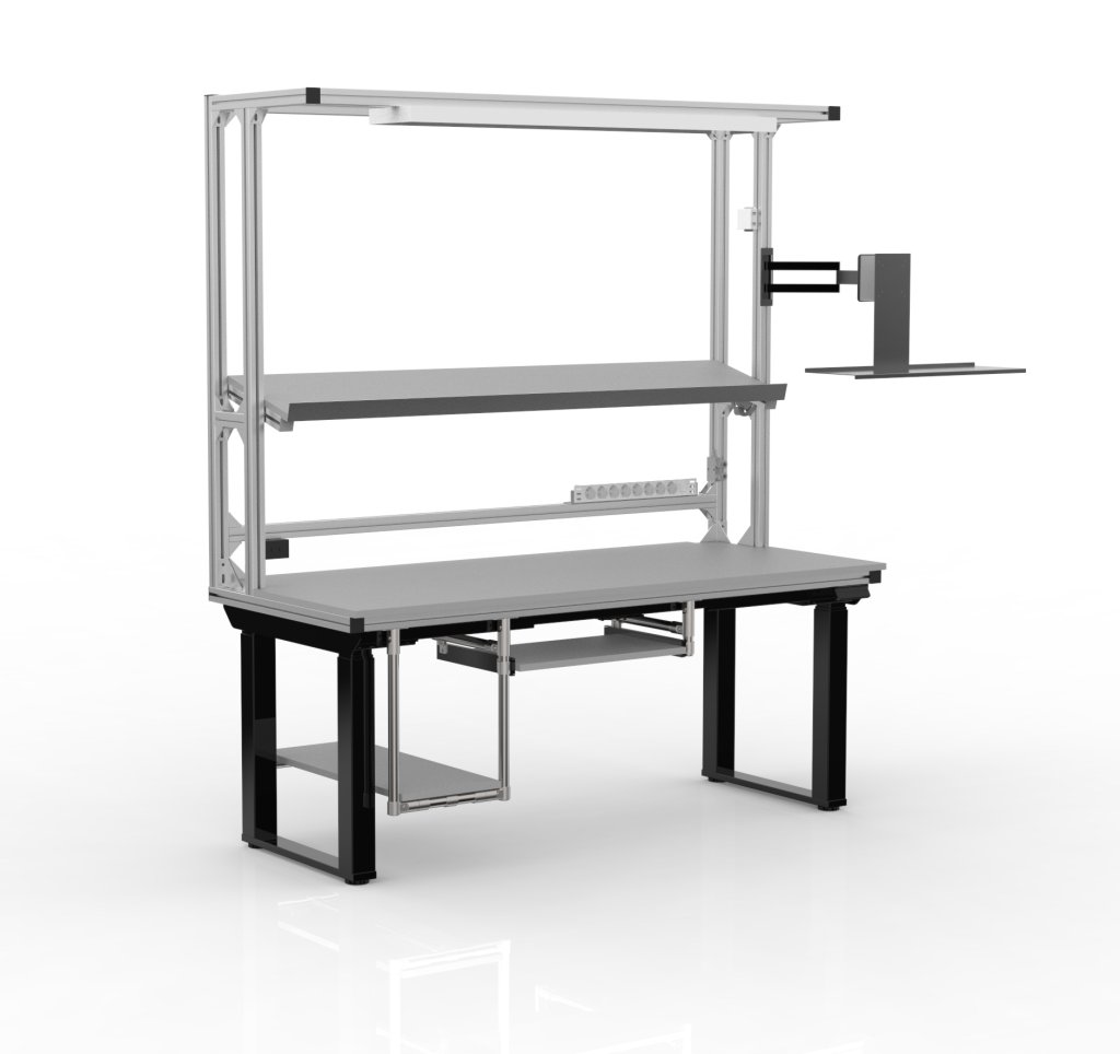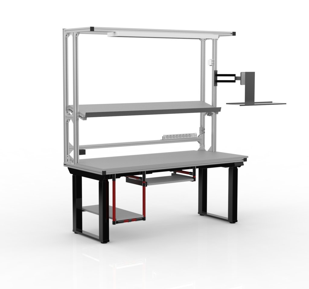 Elektrisch höhenverstellbarer Arbeitstisch mit Aufsatz aus Aluminiumprofilen. Der Tisch umfasst eine 18 mm dicke Arbeitsplatte aus Laminat, zwei untere Regale, einen Monitor- und Tastaturhalter, ein verstellbares Regal mit einer Stoppvorrichtung gegen das Herunterfallen, LED-Beleuchtung. Die Arbeitshöhe ist im Bereich von 717 - 1367 mm verstellbar. Die Gesamttragfähigkeit bei gleichmäßiger Belastung beträgt 200 kg, die Tragfähigkeit des Regals 50 kg, die Tragfähigkeit der Arbeitsfläche 150 kg. Abmessungen: 2000 - 2650 x 1750 x 750 mm.
