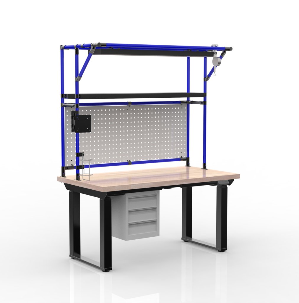 Elektrisch höhenverstellbarer Arbeitstisch mit Arbeitsplatte aus Buchen-Leimholz. Der Tisch ist mit einer Lochwand zur Aufhängung von Boxen oder Werkzeug, einem Container mit drei Schubladen, einem verzinkten Regal, einem Monitorhalter, einem Halter für 2-Liter-PET-Flaschen und LED-Beleuchtung ausgestattet. Die Arbeitshöhe ist im Bereich von 700 - 1350 mm einstellbar. Die Tragfähigkeit bei gleichmäßiger Belastung beträgt 250 kg. Abmessungen: 1800 - 2450 x 1400 x 750 mm.