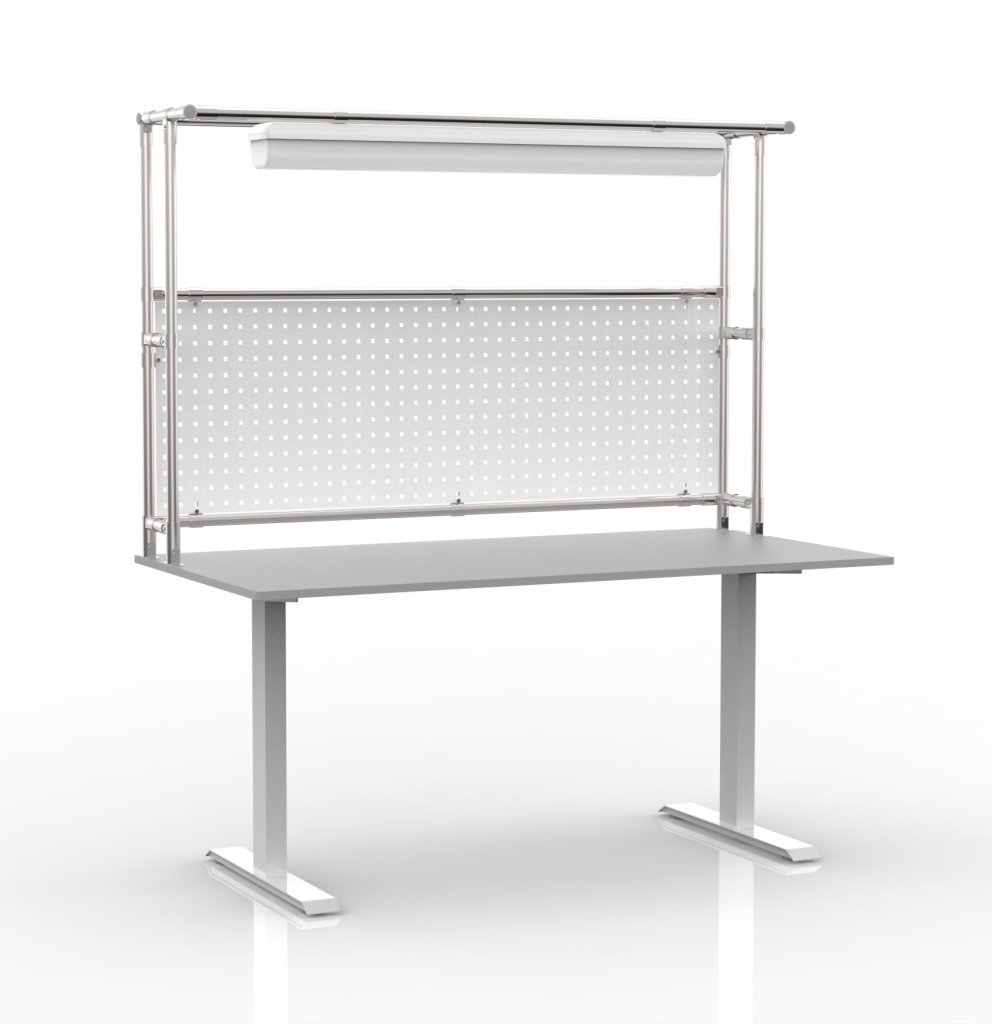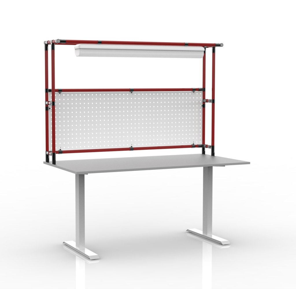 Höhenverstellbarer Tisch mit Aufsatz aus einem Rohrbaukastensystem und Lochblechpaneel. Höhenverstellbereich 726 - 1226 mm. Die Basis des Tisches bildet ein elektrisch höhenverstellbares Gestell mit perfekter Kombination aus Stabilität und Robustheit. Der Tisch ist mit einer 18 mm starken Laminatplatte und LED-Beleuchtung ausgestattet. Tragfähigkeit 70 kg. Tischabmessungen 1765 x 1600 x 800 mm.