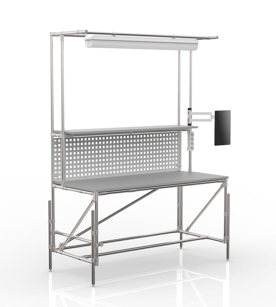 Höhenverstellbarer antistatischer Tisch aus einem Rohrbausatzsystem. Der Tisch ist mit einer ESD-Laminatplatte von 19 mm Dicke ausgestattet, die zuverlässigen Schutz gegen elektrostatische Aufladung bietet. Außerdem enthält er einen ESD-Container, ein ESD-Lochblech, eine Beleuchtung und eine Aluminiumplatte mit A4-Klemme, die Ihnen ermöglicht, wichtige Dokumente griffbereit zu halten. Die Tragfähigkeit bei gleichmäßiger Belastung beträgt 150 kg. Der Tisch hat eine einstellbare Höhe im Bereich von 650 – 950 mm. Abmessungen 2100 x 1500 x 700 mm.