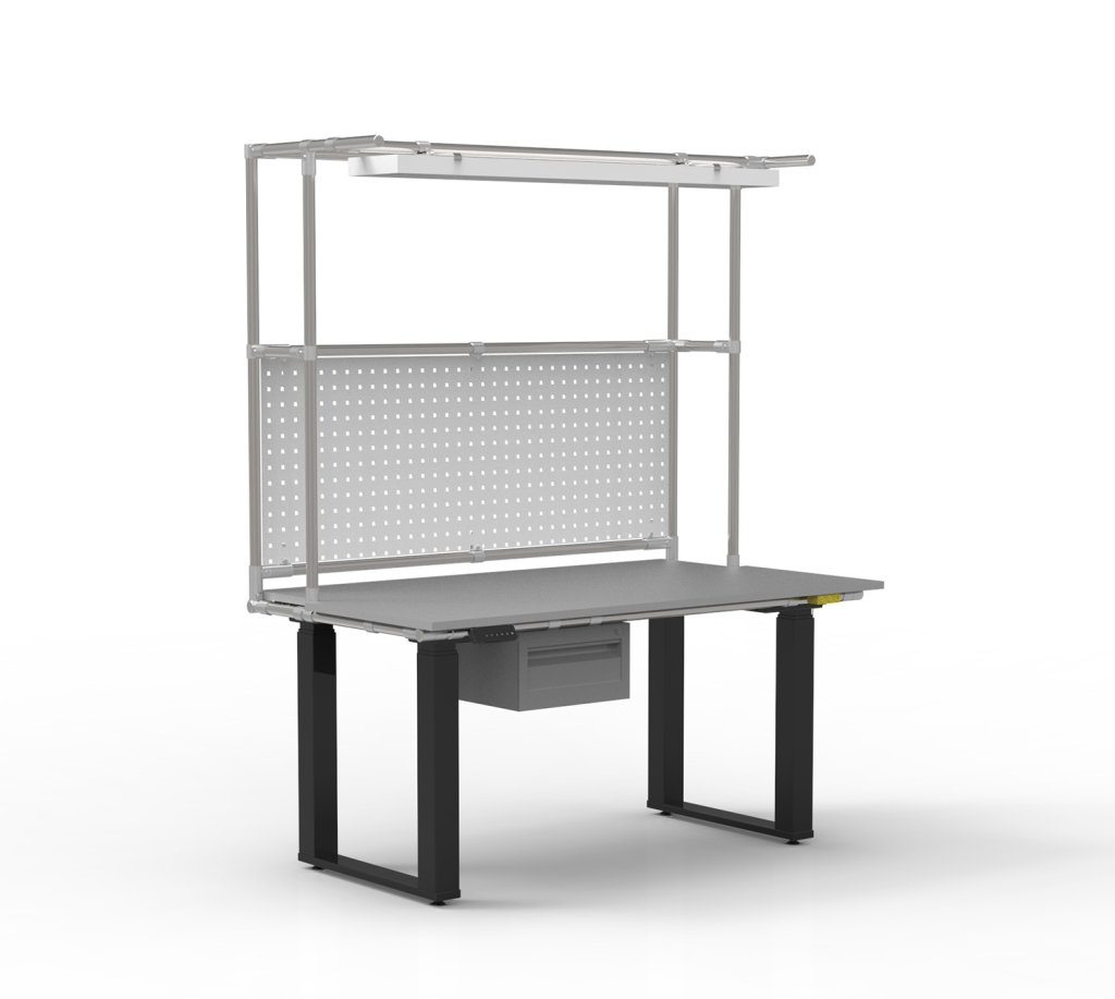 Ergonomischer ESD-Tisch für elektrostatisch geschützte Arbeitsplätze mit einer praktischen Aufsatzkonstruktion aus Rohrsystem. Der Tisch ist mit LED-Beleuchtung, Lochwand und einem Container mit einer Schublade ausgestattet. Er verfügt über eine intuitive Steuerung mit der Möglichkeit, drei voreingestellte Höhen zu speichern, was die ergonomische Einstellung der Arbeitsfläche im Bereich von 680 – 1330 mm erleichtert.