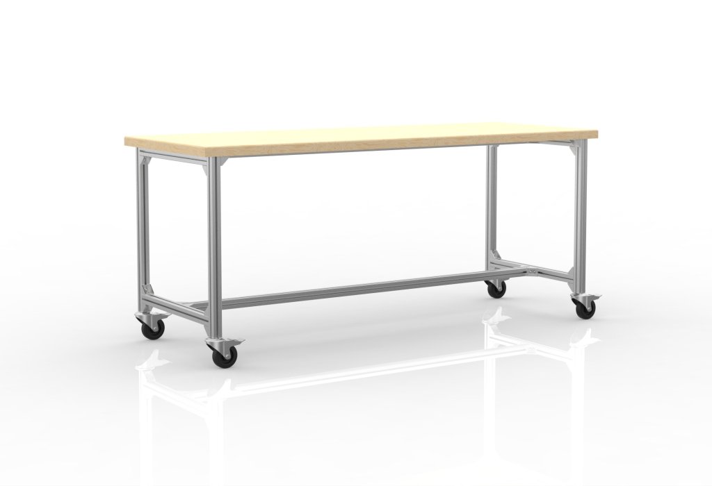 Ein fahrbarer Arbeitstisch aus Aluminiumprofilen, der dank der Rollen eine einfache Handhabung und ein schnelles Versetzen des Arbeitsplatzes ermöglicht.