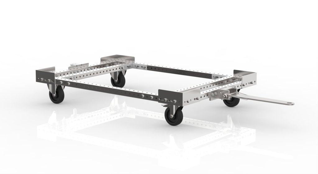 Ein Manipulationsfahrgestell für EURO-Paletten mit einer Deichsel, die es ermöglicht, mehrere Wagen hintereinander zu koppeln (sogenanntes Milk-Run-System). Das Fahrgestell ist für verschiedene Manipulationszwecke in Lagern und Werkstätten geeignet. Dank seiner hohen Tragfähigkeit von 750 kg ist es ideal für den Transport schwerer Gegenstände. Das Fahrgestell ist mit 2 schwenkbaren Rädern mit Bremse und 2 schwenkbaren Rädern ohne Bremse mit einem Durchmesser von 125 mm ausgestattet, die eine einfache Handhabung der Gegenstände ermöglichen. Die Abmessungen des Fahrgestells sind 1240 x 840 x 238 mm. ESD-Variante möglich.