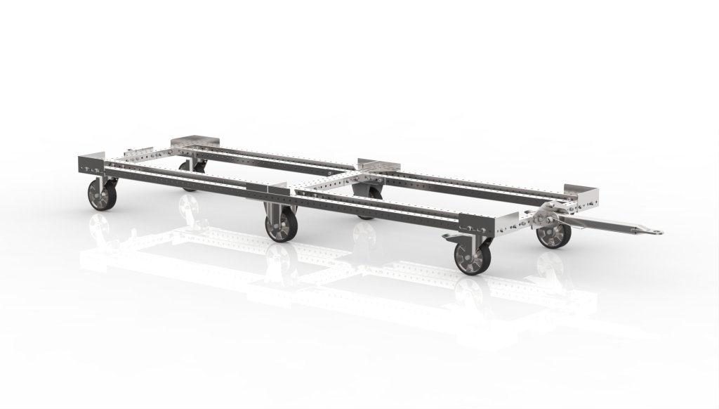 Ein Manipulationsfahrgestell für zwei EURO-Paletten mit einer Deichsel, die es ermöglicht, mehrere Wagen hintereinander zu koppeln (sogenanntes Milk-Run-System). Das Fahrgestell ist für verschiedene Manipulationszwecke in Lagern und Werkstätten geeignet. Dank seiner hohen Tragfähigkeit von 1500 kg ist es ideal für den Transport schwerer Gegenstände. Das Fahrgestell ist mit 2 schwenkbaren Rädern mit Bremse, 2 schwenkbaren Rädern ohne Bremse und 2 festen Rädern mit einem Durchmesser von 160 mm ausgestattet, die eine einfache Handhabung der Gegenstände ermöglichen. Die Abmessungen des Fahrgestells sind 283 x 2480 x 840 mm. ESD-Variante möglich.