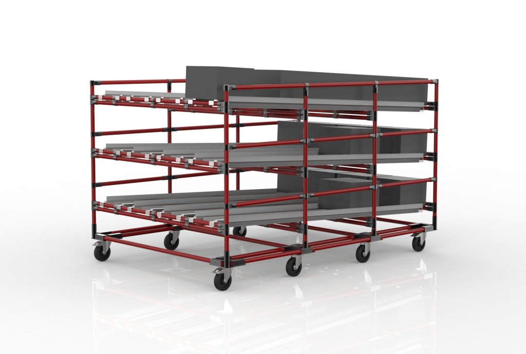 FIFO-Schwerkraftregal mit Rollen aus einem Rohrbaukastensystem. Teil des Systems ist das FIFO-Prinzip (First In, First Out), das vollständige Beschreibung und Parameter