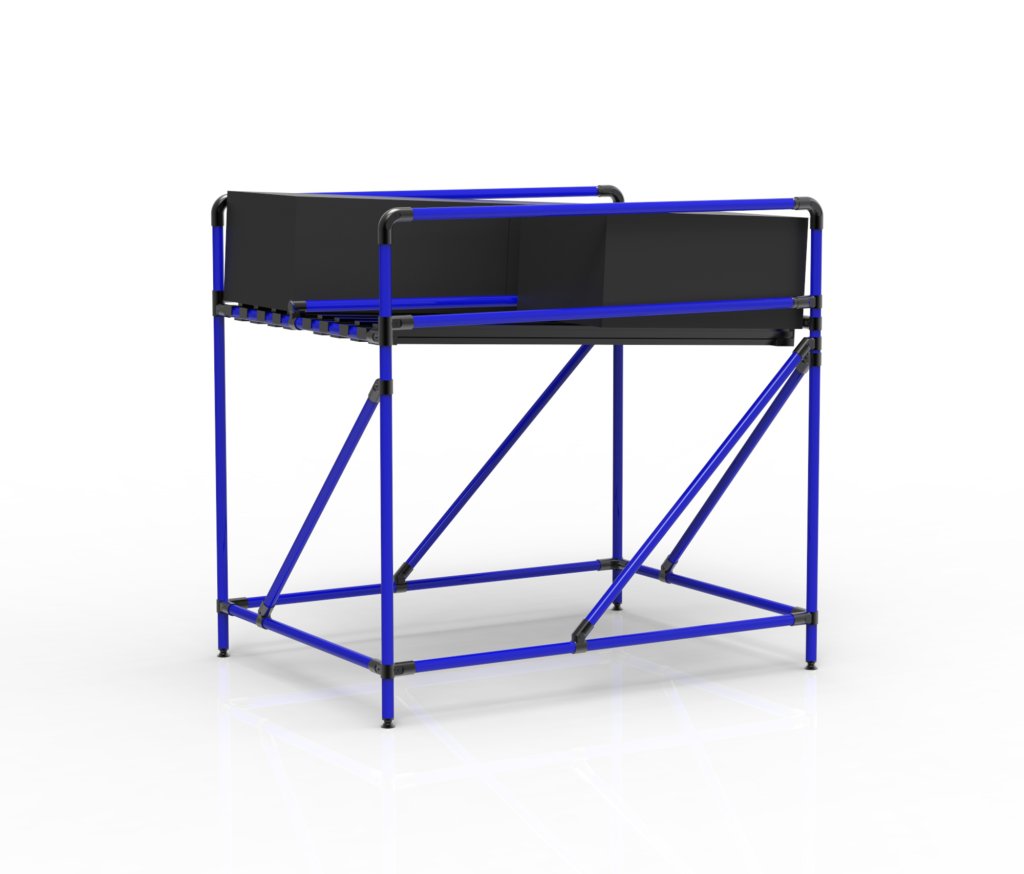 Ein Gefälle Förderer aus einem Rohrbausatzsystem ist für die Lagerung von KLT-Behältern und -Boxen mit den Maßen 600 x 400 x 280 mm vorgesehen. Dieser innovative Förderer ist so konzipiert, dass er die Materialhandhabung erleichtert und die Arbeitseffizienz verbessert. Die Regale bestehen aus Rollenbahnen, die es ermöglichen, KLT-Behälter leicht und reibungslos über die gesamte Länge des Förderers in Richtung des Gefälles der Rollenbahnen zu bewegen. Die Gesamtkapazität beträgt 100 kg. Abmessungen: 1202 x 943 x 1253 mm.