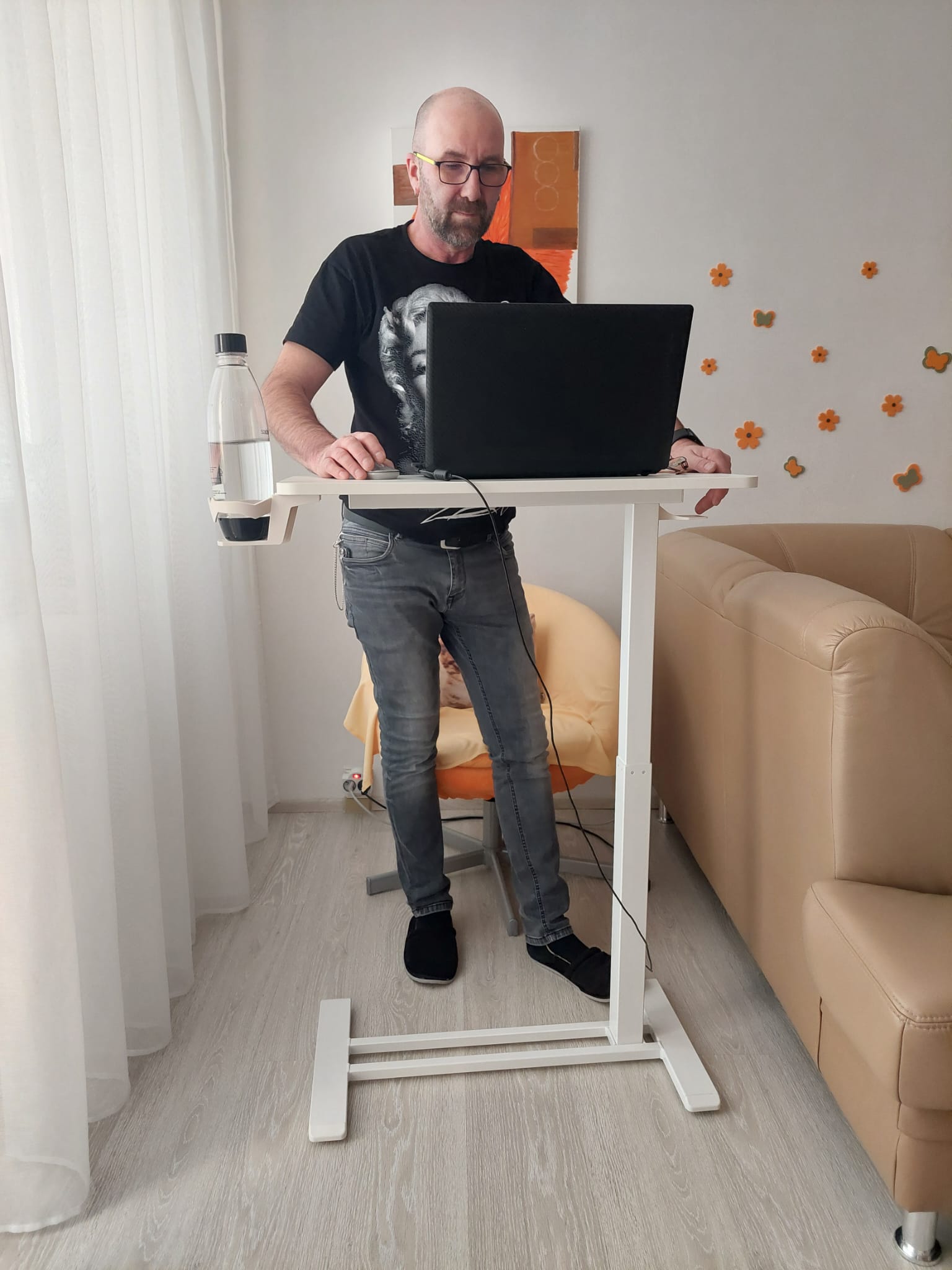Der manuell höhenverstellbare Büro- und Schreibtisch mit vier versteckten Rollen ist der ideale tragbare Arbeitsplatz für Zuhause oder Büro. Die eingebaute Gasfeder des Tisches ermöglicht eine einfache und sanfte Höhenverstellung im Bereich von 660 - 1060 mm. Die Tischplatte verfügt über einen praktischen Getränkehalter. Der Tisch ist in weißer Farbe. Abmessungen: 660 - 1060 x 700 x 400 mm.