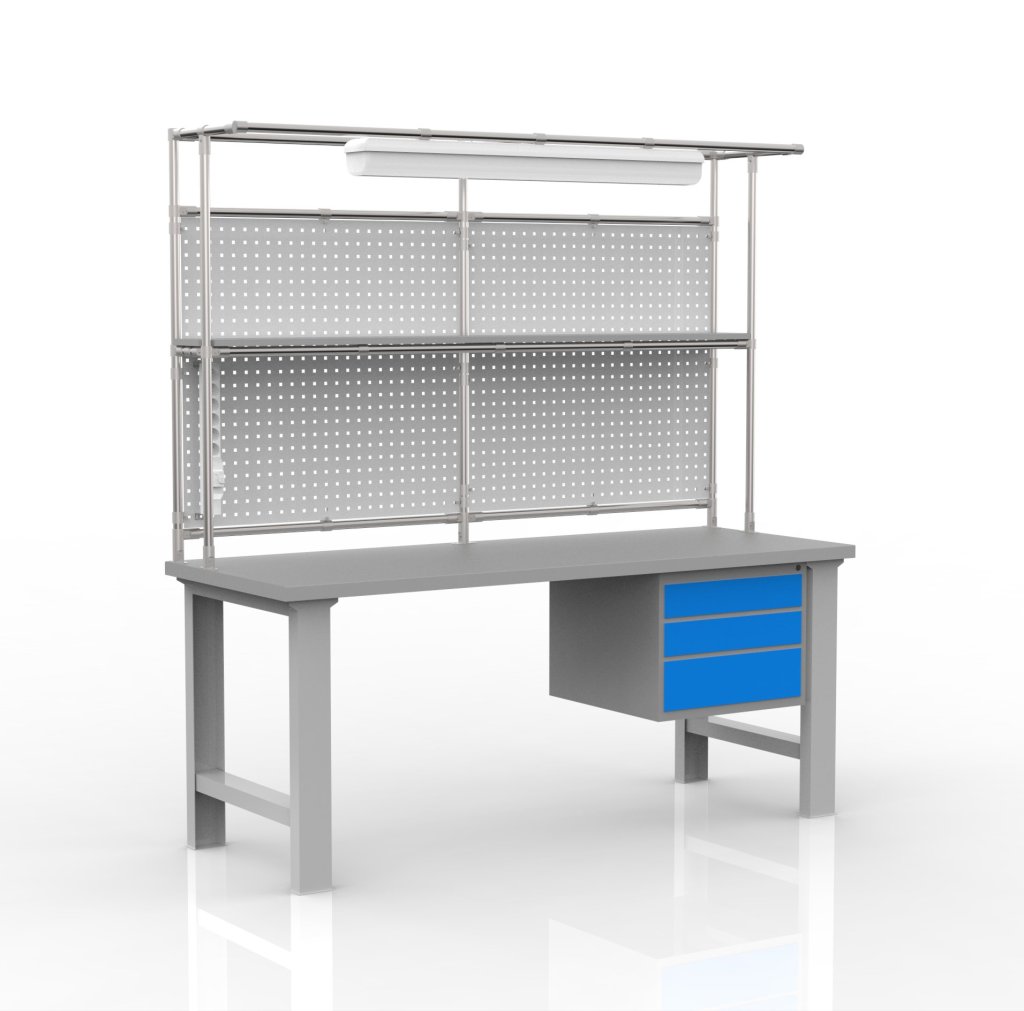 Höhenverstellbarer Werkbank mit Aufbau aus Rohrsystem. Der Tisch umfasst eine Arbeitsplatte aus Buchenleimholz, einen hängenden Container mit drei Schubladen, eine Lochplatte zum Aufhängen von Boxen oder Werkzeugen, ein Regal aus Laminatplatte, eine Steckdose mit Schalter und LED-Beleuchtung. Die Arbeitshöhe ist einstellbar im Bereich von 830 - 1070 mm. Tragfähigkeit bei gleichmäßiger Belastung beträgt 300 kg, Tragfähigkeit des Regals 30 kg. Maße 2080 x 2000 x 750 mm.
