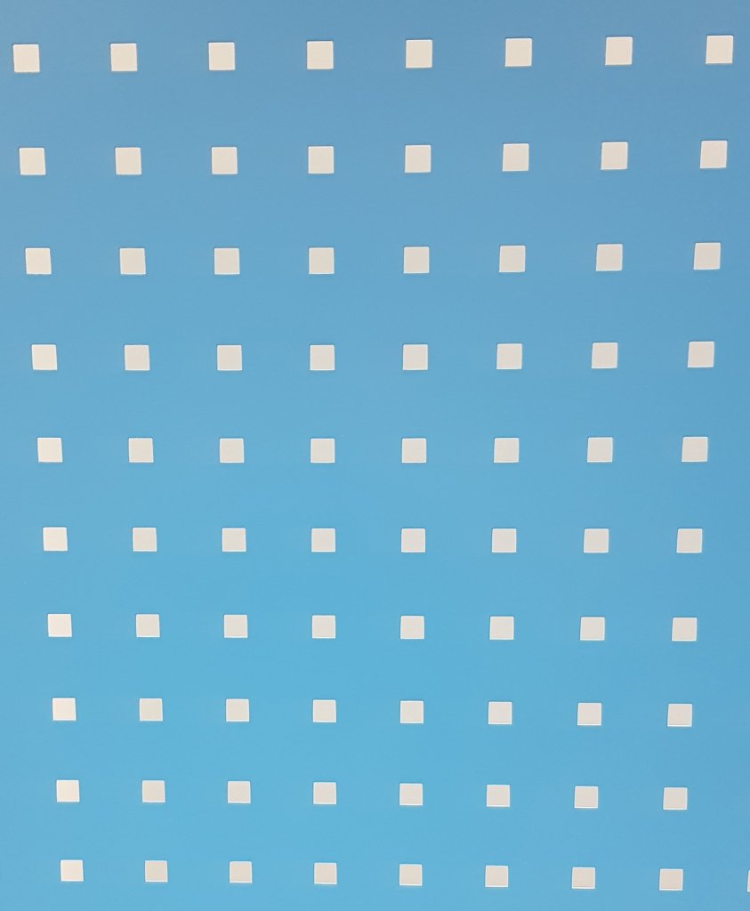 Lochplatte, ideal zum Aufhängen von Werkzeugen und für den schnellen Zugriff auf Verbindungselemente. Abmessungen 2000 x 1000 mm, Dicke 1,4 mm, quadratische Öffnungen 10 x 10 mm, Lochabstand 38 x 38 mm, Farbe blau RAL 5012 seidenmatt.