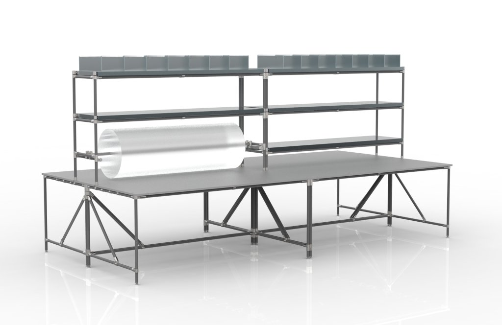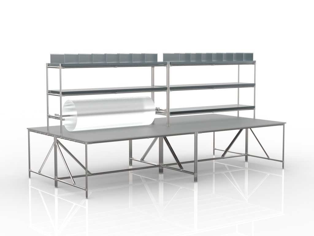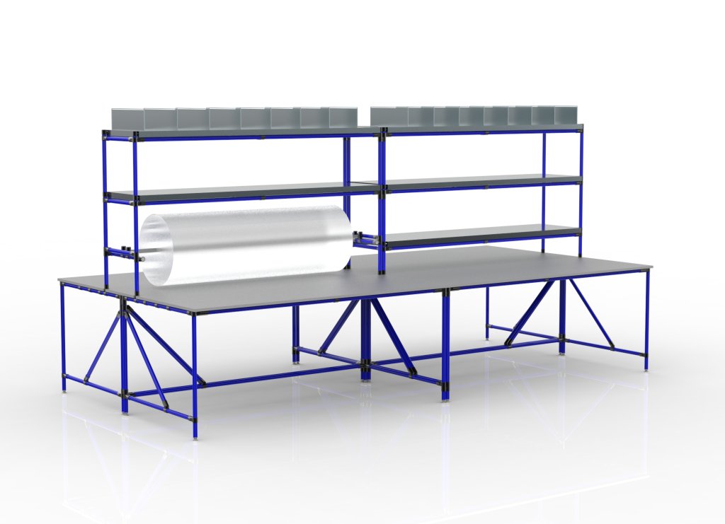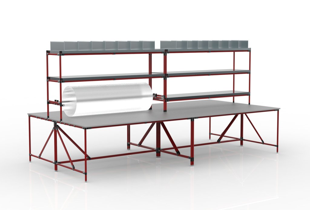 Universaler Verpackungstisch für die Zusammenstellung und den Versand von Sendungen. Die Farbe der Konstruktion kann je nach den Rohren ausgewählt werden. Tragfähigkeit bei gleichmäßiger Lastverteilung 100 kg. Maße 2002 x 1803 x 803 mm. Der Tisch ist geeignet für E-Shops, Logistikzentren und Lager.
