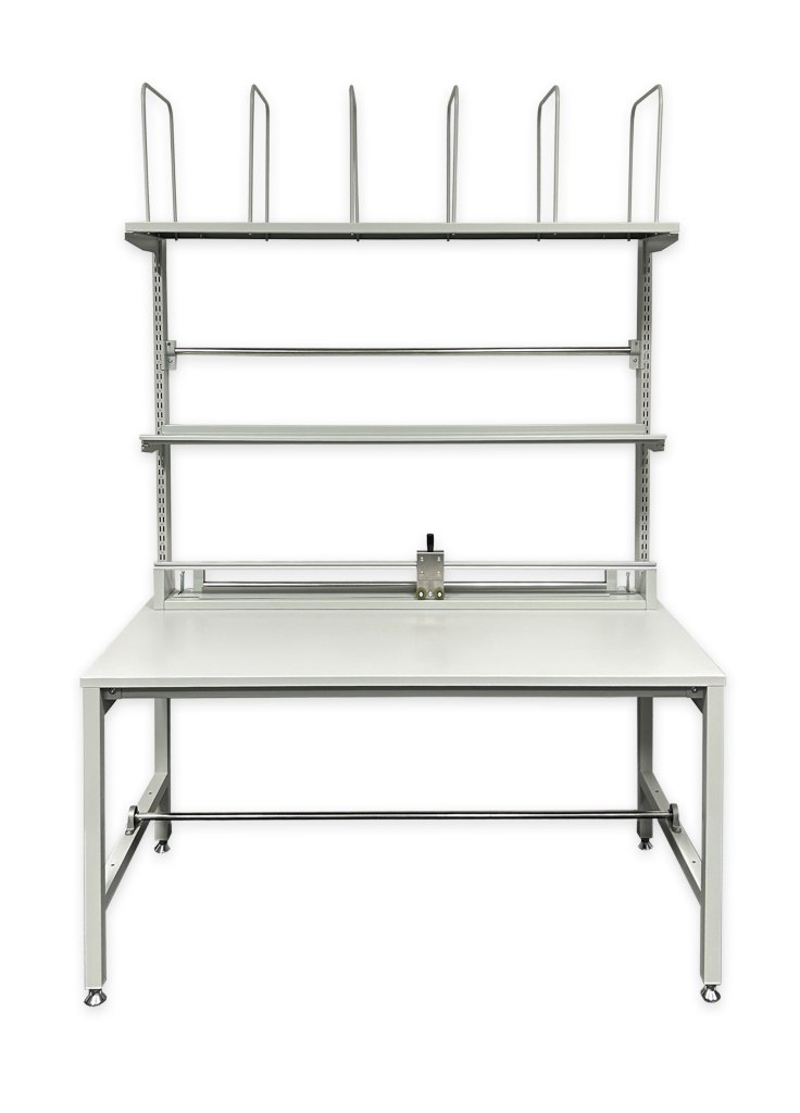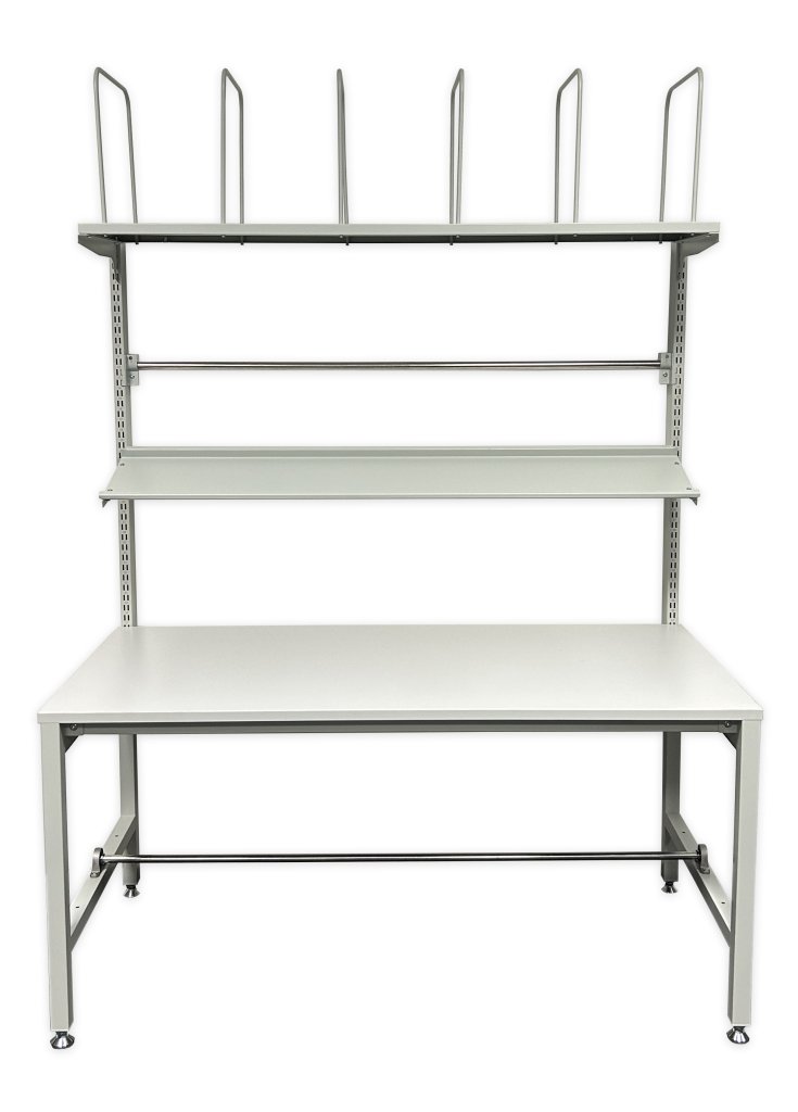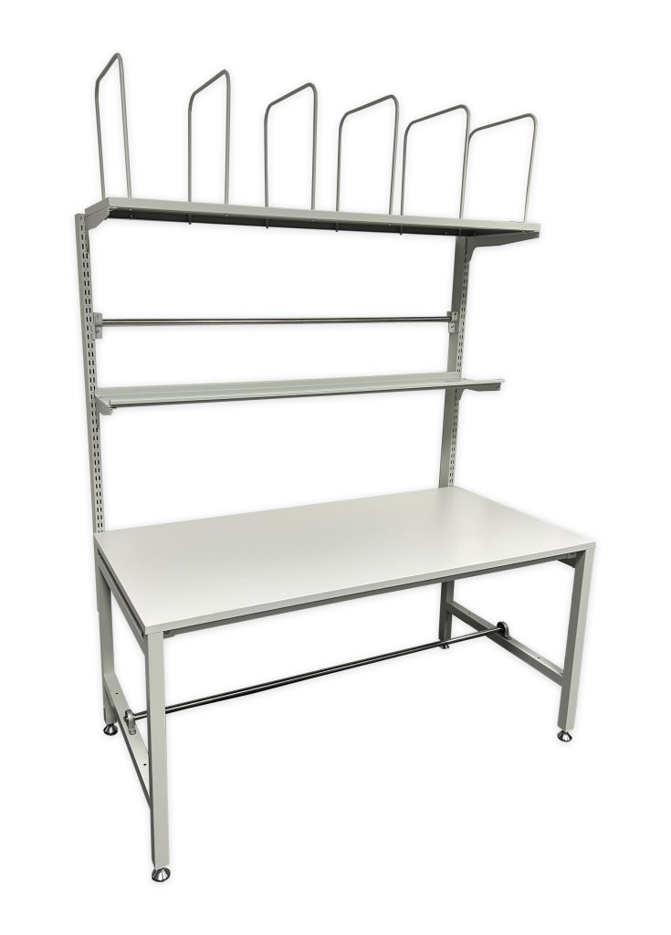 Universeller Packtisch für die Kommissionierung und den Versand von Sendungen in Verpackungszentren. Maße: Höhe 2170 x Breite 1550 x Tiefe 800 mm. Farbe der Platte und der Konstruktion: Grau RAL 7035.