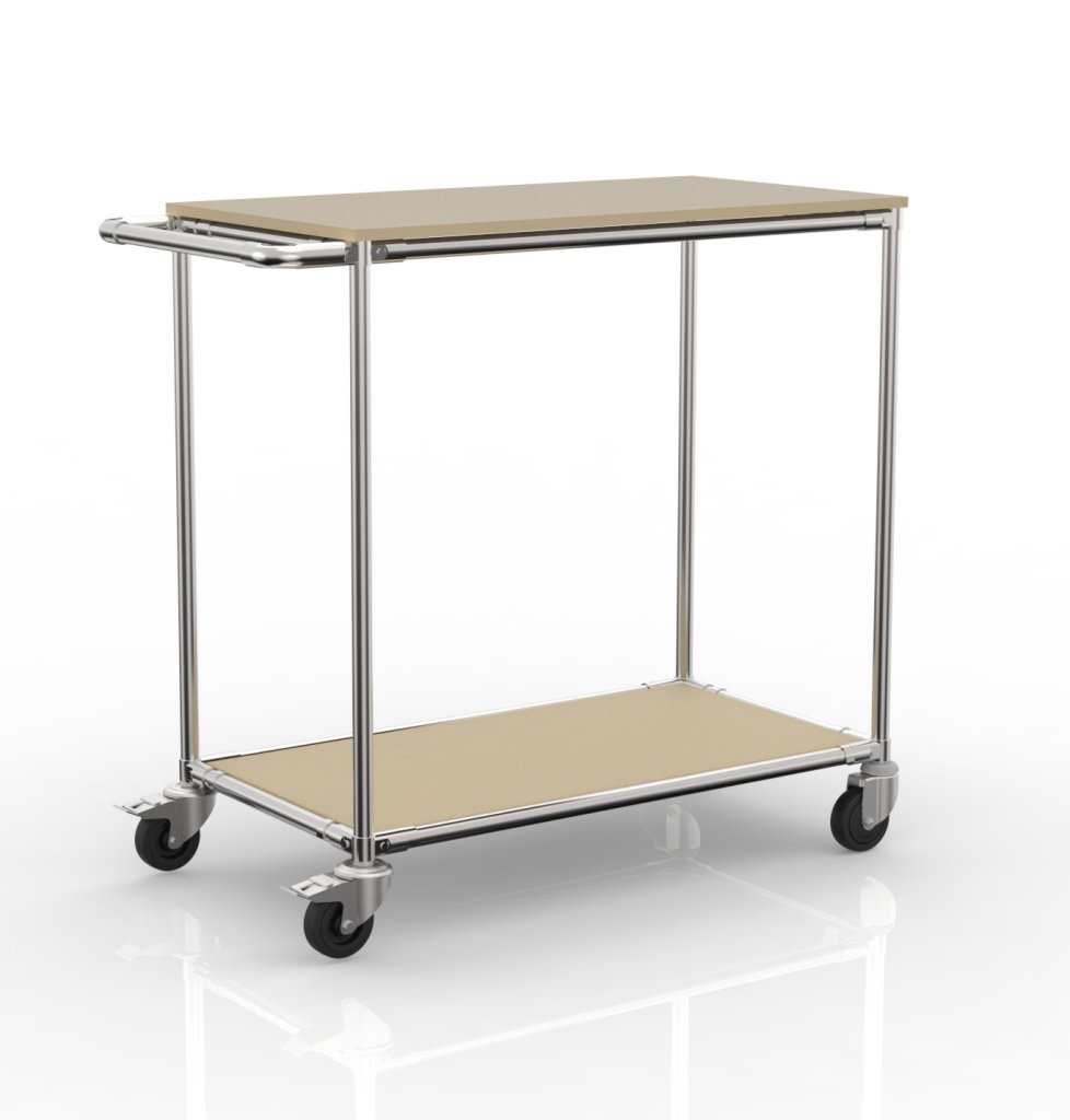 Der Regalwagen aus einem Rohrbaukastensystem stellt eine moderne und kostengünstige Alternative zu herkömmlichen Regalwagen mit Stahlkonstruktion dar. Die Ladefläche besteht aus hochwertigen DTDS Kronospan-Platten, die zuverlässigen Halt bieten und gegen normalen Verschleiß beständig sind. Der Regalwagen ist mit 4 Rädern für eine einfache Handhabung ausgestattet - 2 drehbare Räder mit Bremse und 2 drehbare Räder ohne Bremse. Tragfähigkeit pro Etage 100 kg, Gesamttragfähigkeit 200 kg. Abmessungen des Wagens 1010 x 525 x 975 mm.