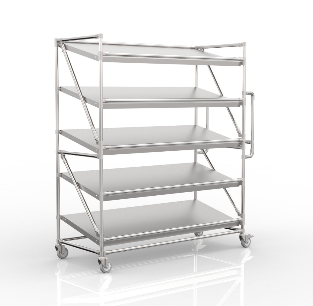 Regalwagen für Transportbehälter mit fünf schrägen Regalböden ist ein praktischer Helfer für den Einsatz in Produktionsbetrieben vollständige Beschreibung und Parameter