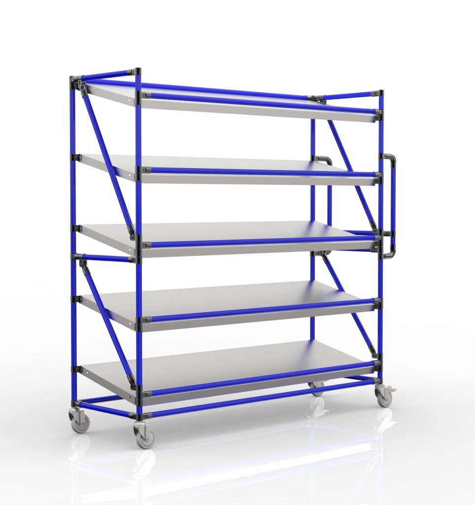 Ein Regalwagen für Kisten mit fünf schrägen Ablagen ist ein praktischer Helfer für die Handhabung in Produktionsbetrieben und Logistikzentren, insbesondere im E-Commerce-Bereich.