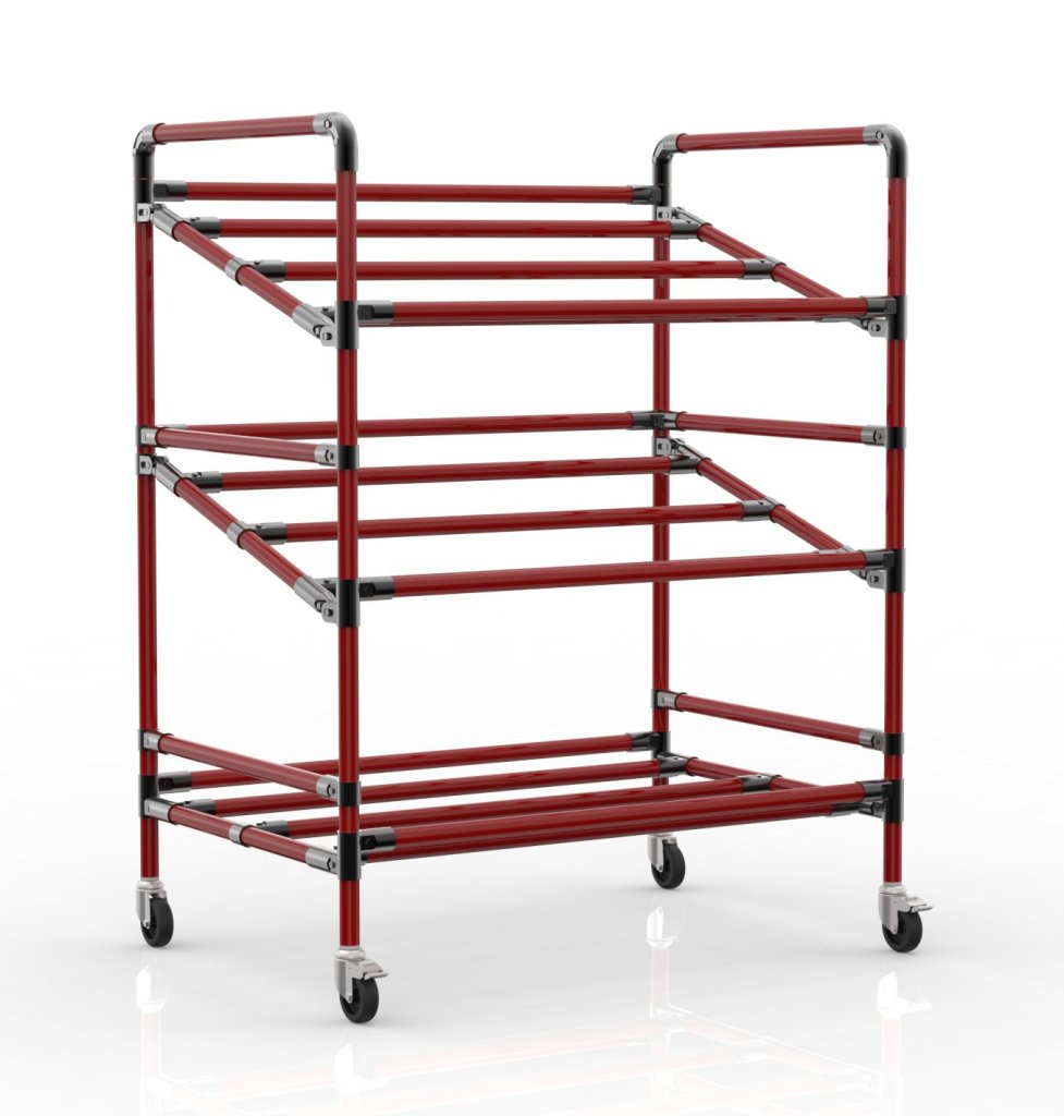 Regalwagen aus einem Rohrbaukastensystem mit einer geraden und zwei schrägen Regalböden ist ein praktischer Helfer für die Handhabung in Produktionsunternehmen und Logistikzentren. Der Wagen ist mit zwei drehbaren Rollen mit Bremse und zwei drehbaren Rollen ohne Bremse mit einem Durchmesser von 75 mm ausgestattet. Der Vorteil dieser Rollen ist der geringe Rollwiderstand, der eine komfortable Handhabung ermöglicht. Die Konfiguration der Rollen kann nach Kundenwunsch geändert werden. Gesamttragfähigkeit 180 kg, Tragfähigkeit pro Regalboden 60 kg. Abmessungen 1250 x 972 x 670 mm.