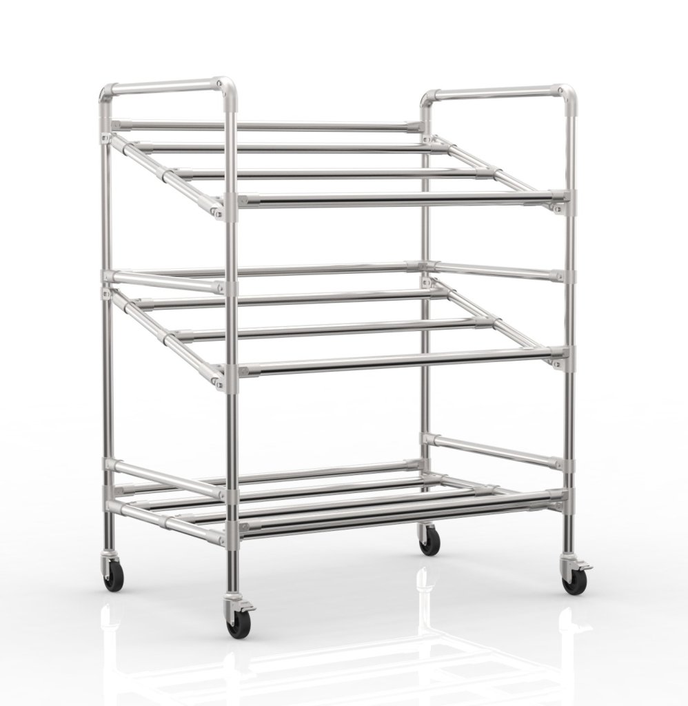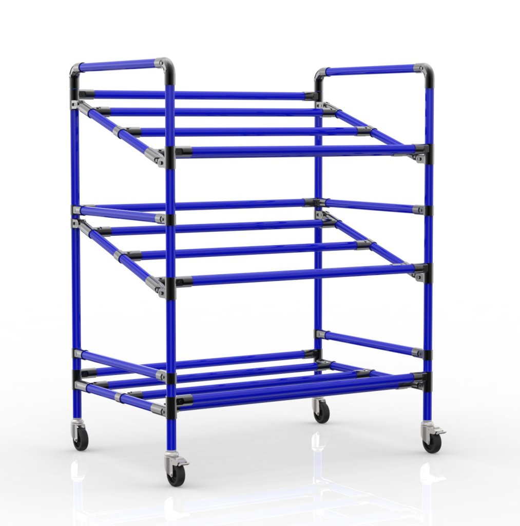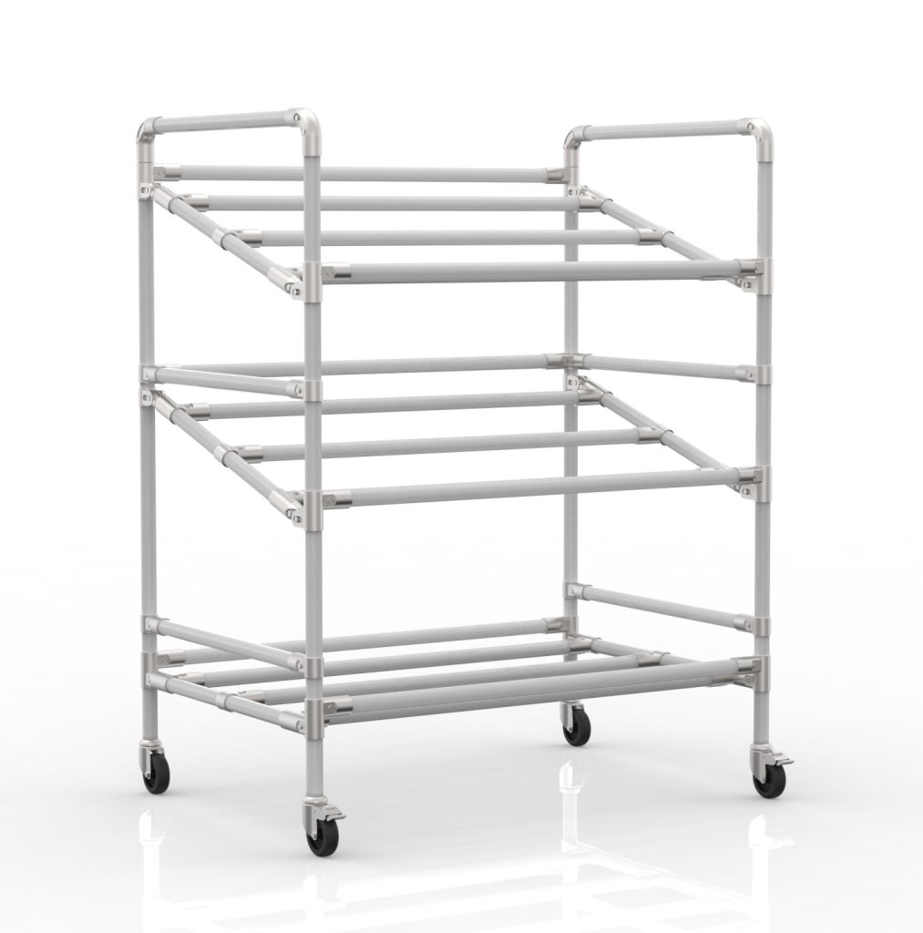 Regalwagen aus einem Rohrbaukastensystem mit einer geraden und zwei schrägen Regalböden ist ein praktischer Helfer für die vollständige Beschreibung und Parameter
