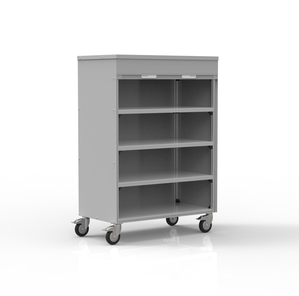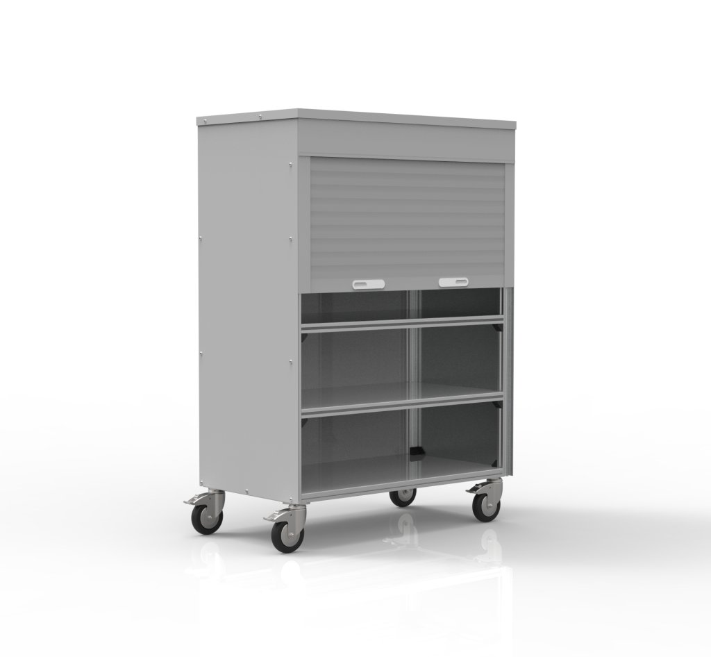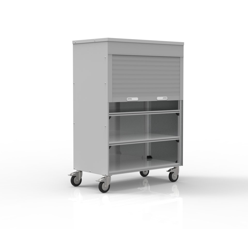 Das Regalwagen mit Rollladen ist aus Aluminiumprofilen gefertigt, was sowohl Stabilität als auch Langlebigkeit der gesamten Konstruktion gewährleistet. Der Wagen ist mit einem Rollladen, drei Regalböden mit 18 mm dicker Laminatplatte, Kunststoffgriffen für einfache Handhabung, seitlichen und hinteren Seiten aus transparenten PET-G-Platten sowie vier lenkbaren Rollen mit Bremse und einem Durchmesser von 100 mm ausgestattet. Tragfähigkeit des Wagens: 150 kg, Tragfähigkeit pro Regal: 50 kg. Abmessungen: 1500 x 1250 x 640 mm.