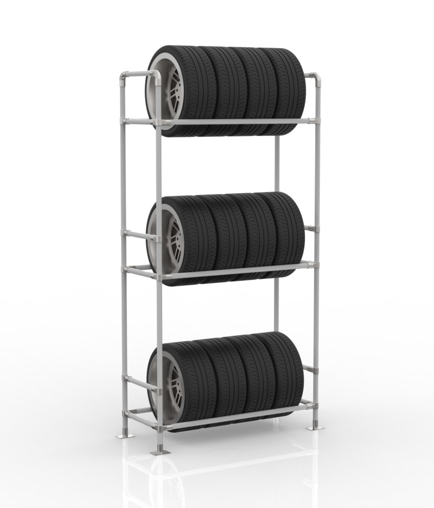 Reifenständer aus einem Rohrbaukastensystem mit drei Regalen. Praktische Lagerung von bis zu 12 Reifen auf drei Ebenen. Ideal für vollständige Beschreibung und Parameter