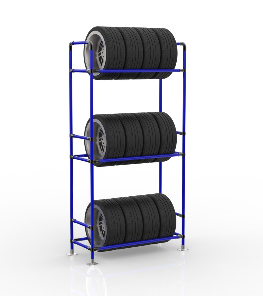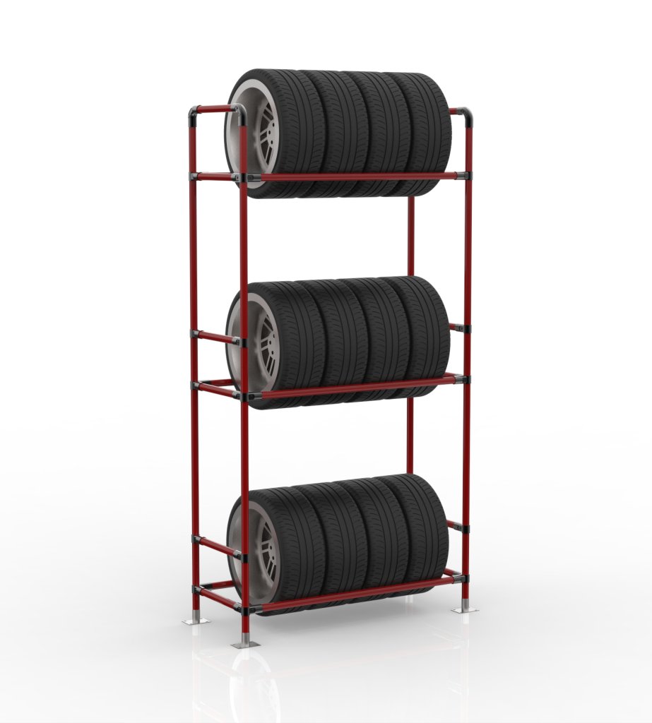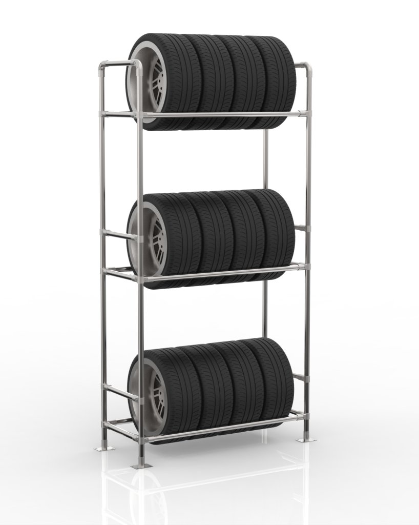 Reifenständer aus einem Rohrbaukastensystem mit drei Regalen. Praktische Lagerung von bis zu 12 Reifen auf drei Ebenen. Ideal für vollständige Beschreibung und Parameter