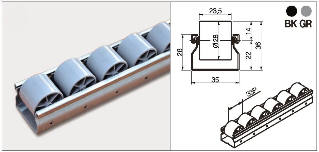 Rollenbahn, Breite 35 mm, Länge 4000 mm, aus Stahl, Rollen-Durchmesser 28 mm, Farbe grau (GR) oder schwarz (BK). vollständige Beschreibung und Parameter