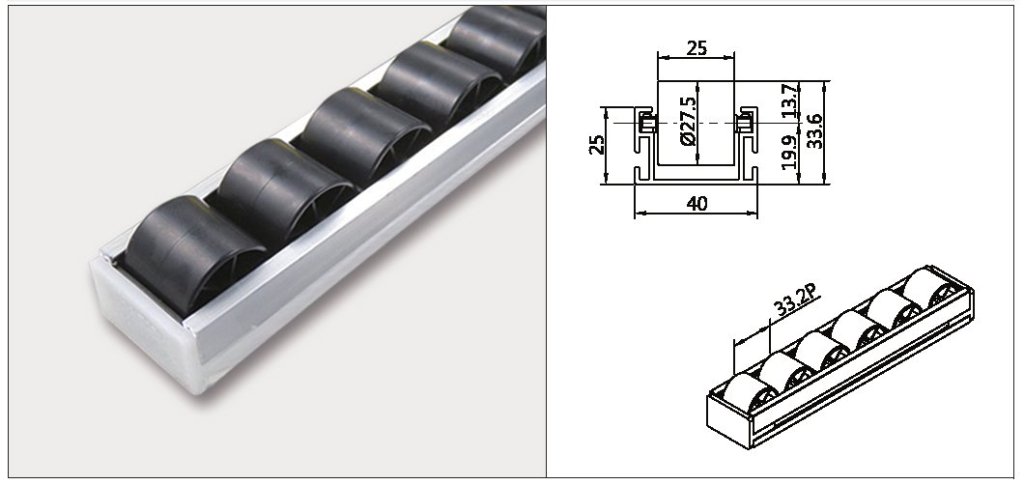 Rollebahn, Breite 40 mm, Länge 4000 mm, aus Aluminium, Rollen Ø 27,5 mm, ESD Ausführung. vollständige Beschreibung und Parameter