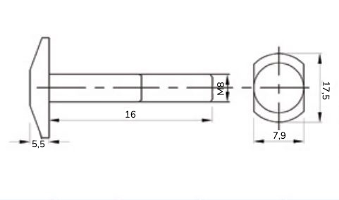 Schraube mit T-Kopf zur Befestigung von Zubehör an Aluminiumprofilen. Schraubenlänge 16 mm. Gewicht 10 g. vollständige Beschreibung und Parameter