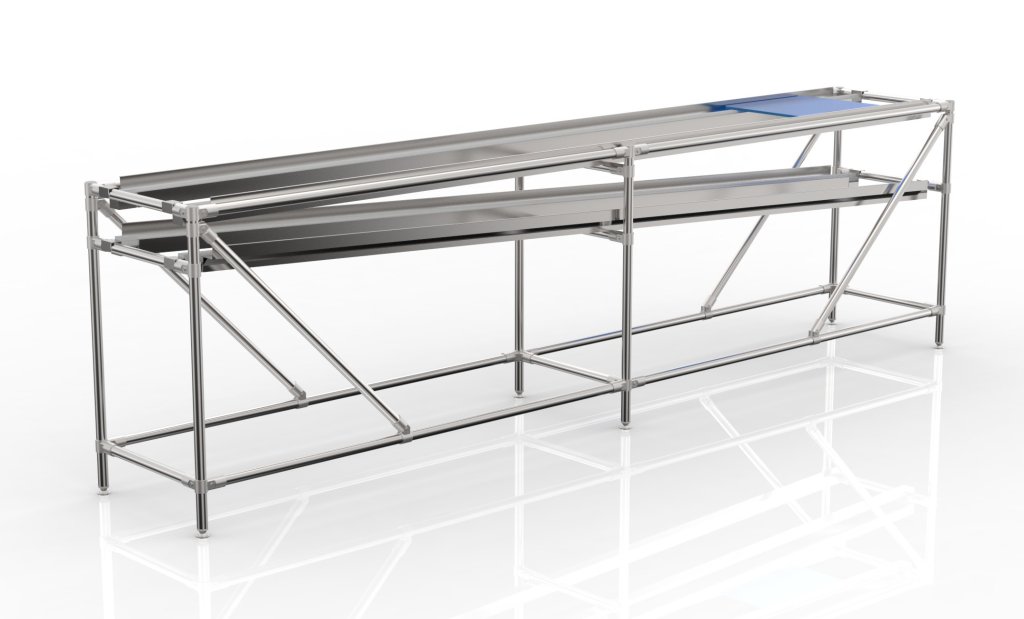 Schwerkraftförderer aus einem Rohrsystem zur Materialbewegung. Das System nutzt Rollenbahnen zur Materialübertragung. Durch die untere Rollenbahn mit Neigung werden leere Kunststoffpaletten automatisch zum Anfang des Förderers zurückgeführt. Tragfähigkeit pro Ebene 200 kg, Gesamttragfähigkeit 400 kg. Abmessungen 840 x 3003 x 503 mm.