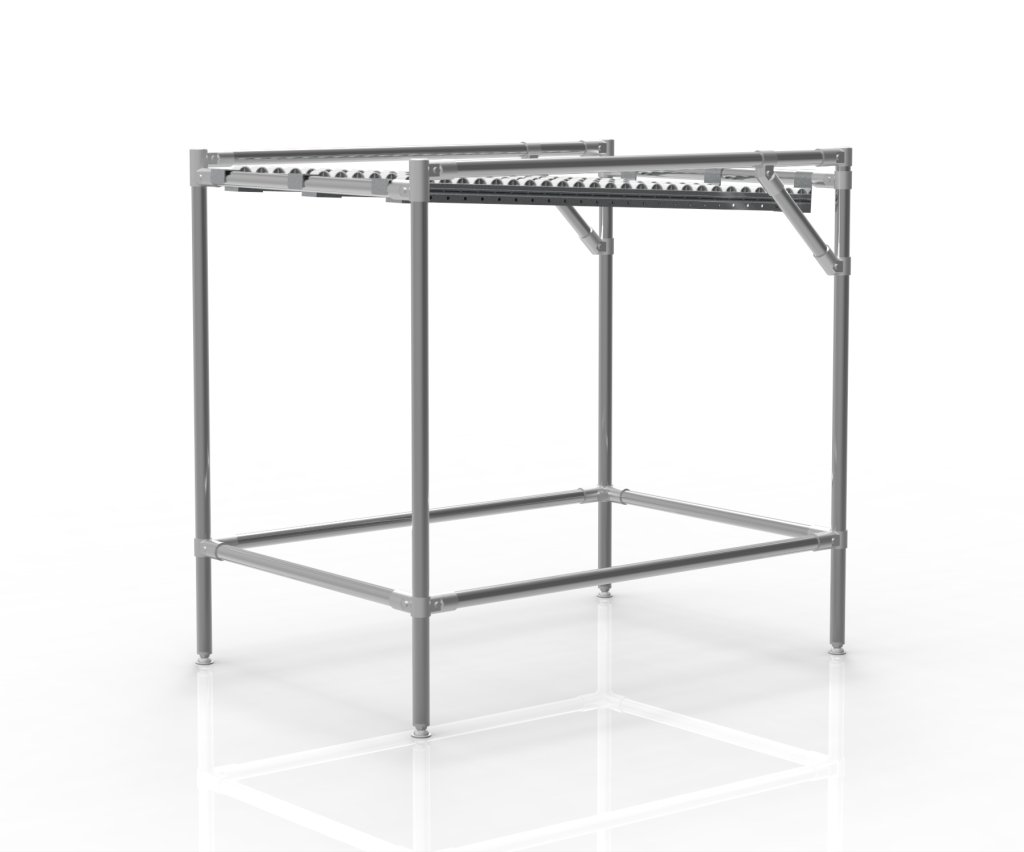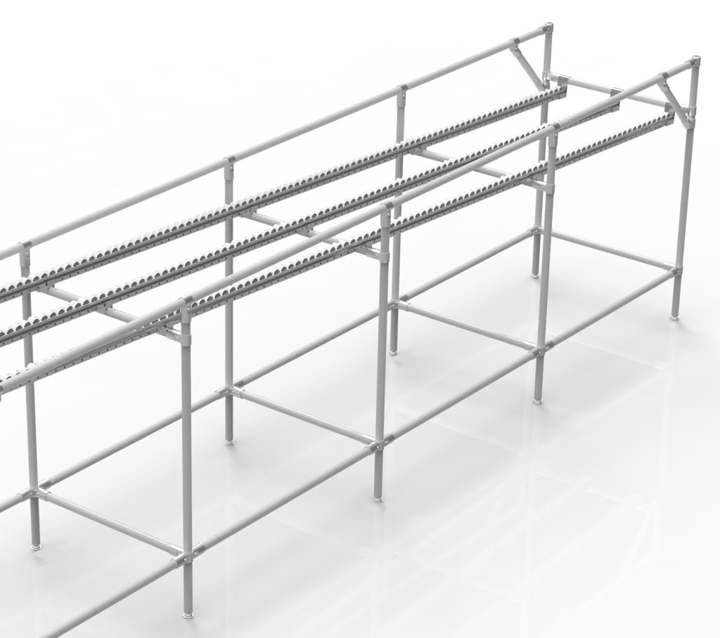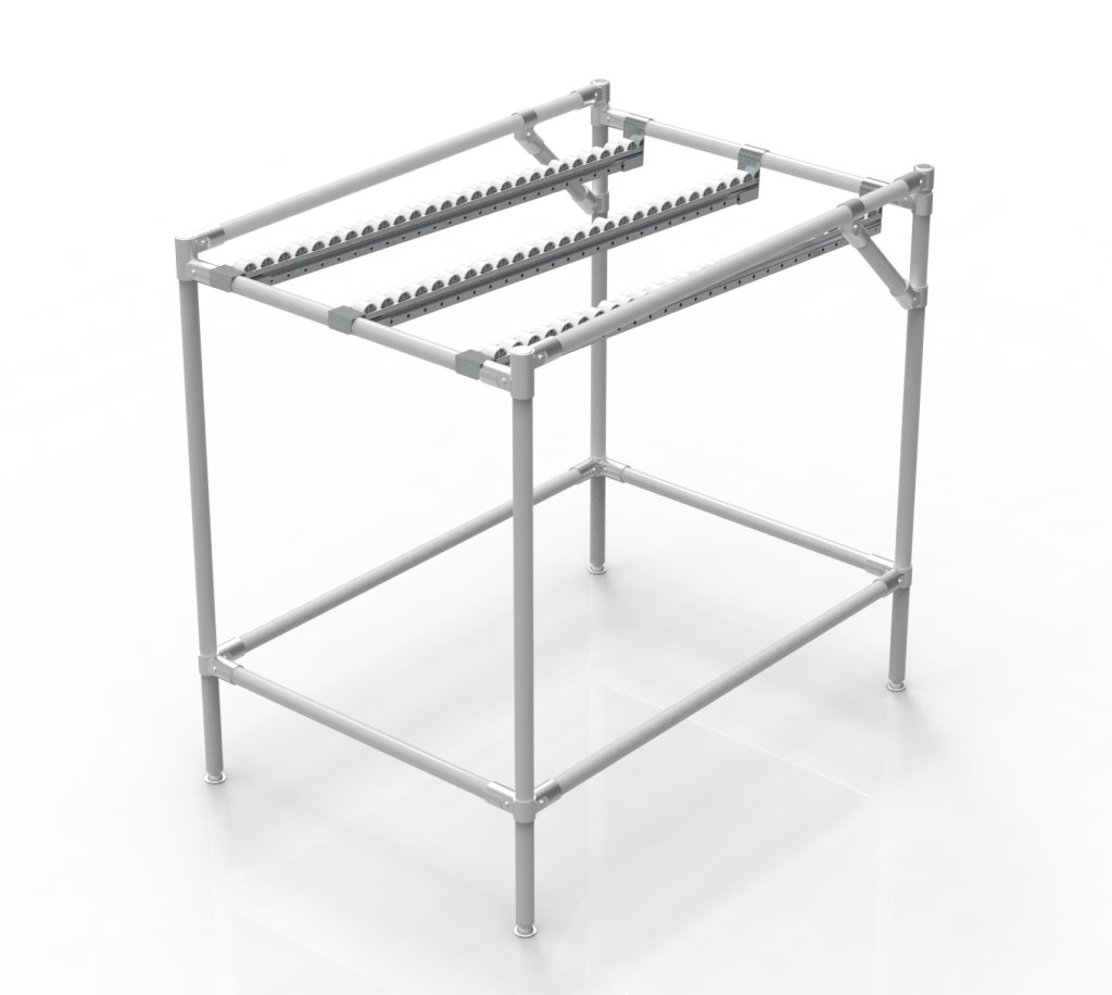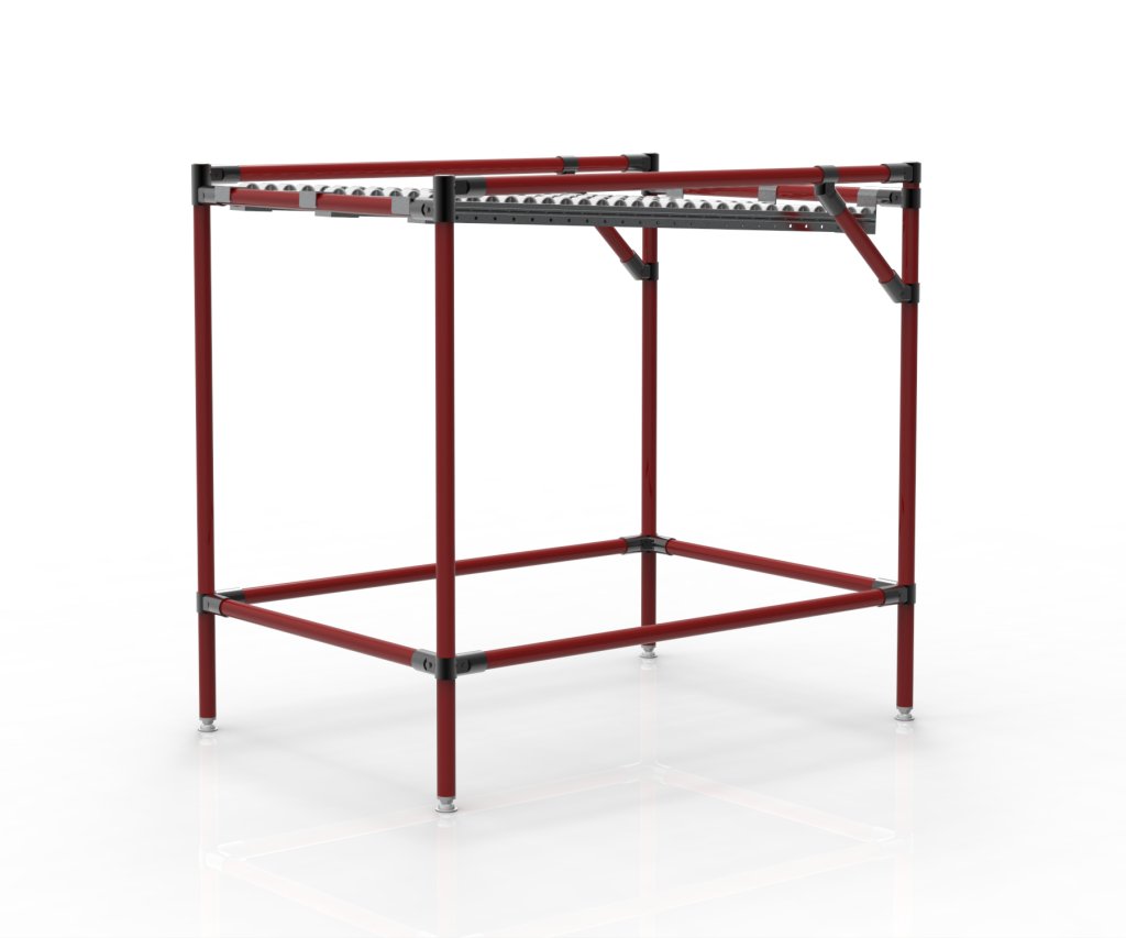 Der Schwerkraftförderer aus einem Rohrbaukastensystem ist für die effiziente Lagerung und den Transport von KLT-Boxen und vollständige Beschreibung und Parameter