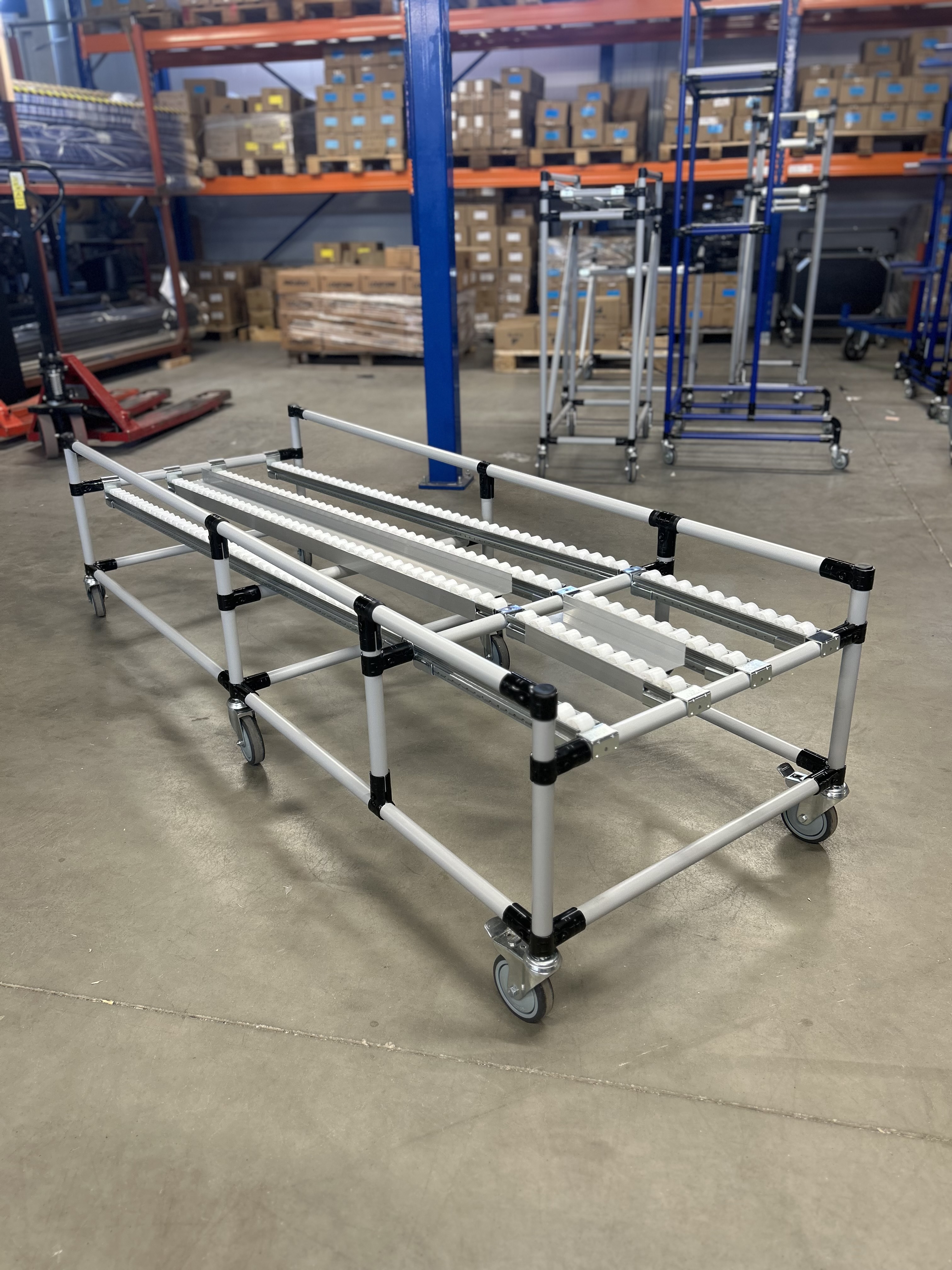 Der Schwerkraftförderer aus einem Rohrbaukastensystem ist für die effiziente Lagerung und den Transport von KLT-Boxen und Behältern konzipiert. Er besteht aus Rollenbahnen, die eine leichte und gleichmäßige Bewegung der Boxen über die gesamte Länge des Förderers in Richtung Gefälle ermöglichen.