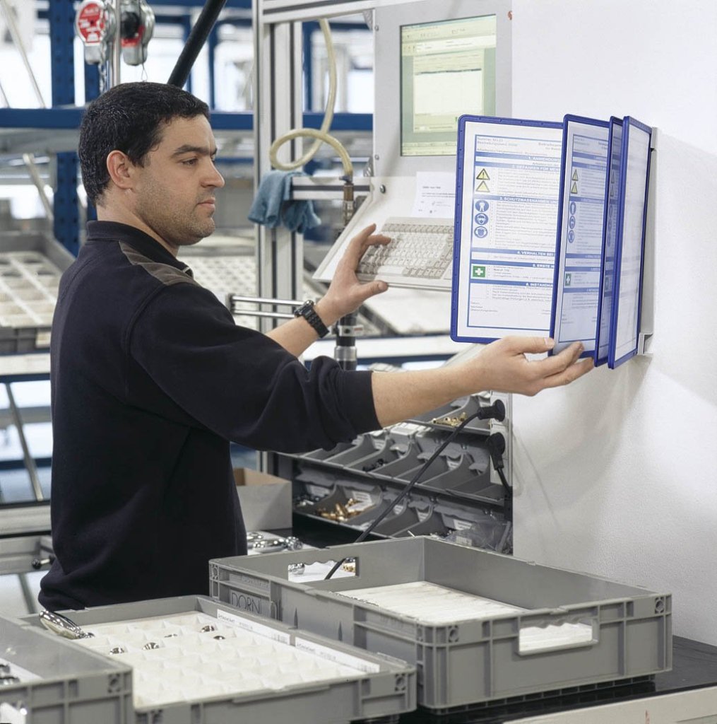 DURABLE Sichttafelsystem VARIO® WALL 20, eignet sich dank robuster Halterungen für den dauerhaften Einsatz in Lager- und Produktionsumgebungen.