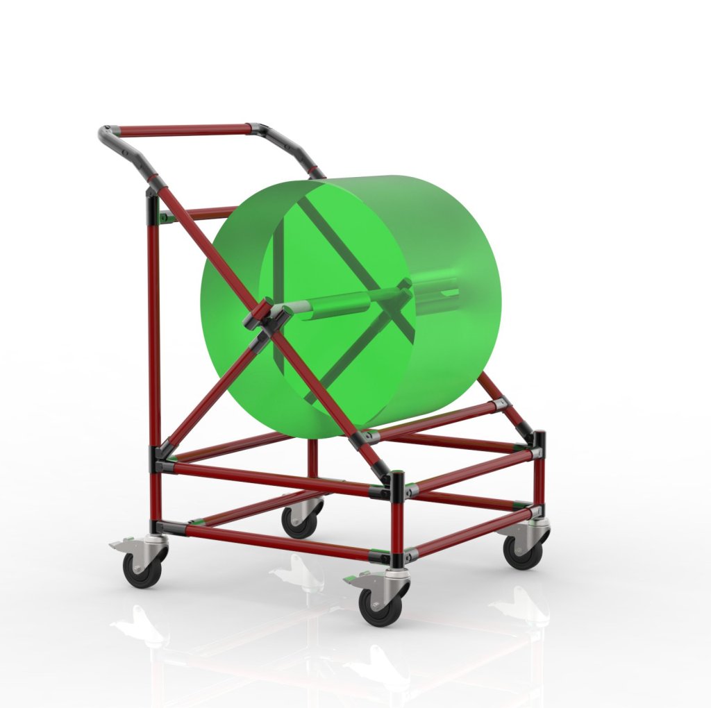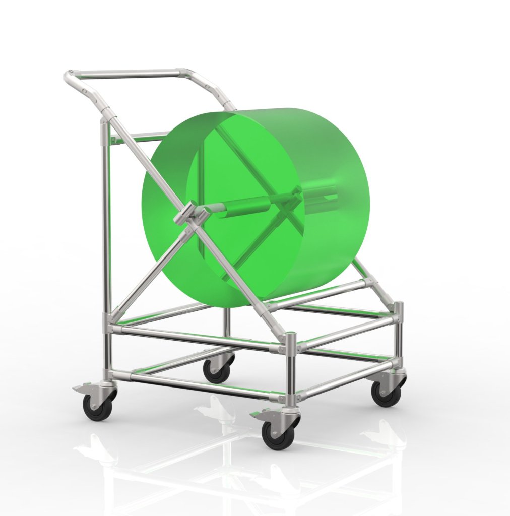 Der Spulenwagen ist ein handbetriebener Wagen, der für die Lagerung und den Transport großer Spulen mit Drähten und Kabeln ausgelegt ist. Die Räder sind mit Bremsen ausgestattet, die eine ungewollte Bewegung des Wagens verhindern, wenn er nicht benutzt wird. Die Farbe der Konstruktion ist wählbar gemäß den verfügbaren Rohren auf der Website.