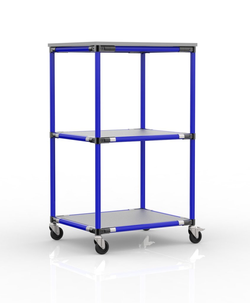 Ein Regalwagen aus einem Rohrbaukastensystem, geeignet für Industrieumgebungen, Lager und Produktionshallen. Geeignet für den Transport von Waren und Materialien. Laminatplatte mit einer Stärke von 18 mm, Tragfähigkeit des Wagens 150 kg, Tragfähigkeit pro Etage 50 kg.