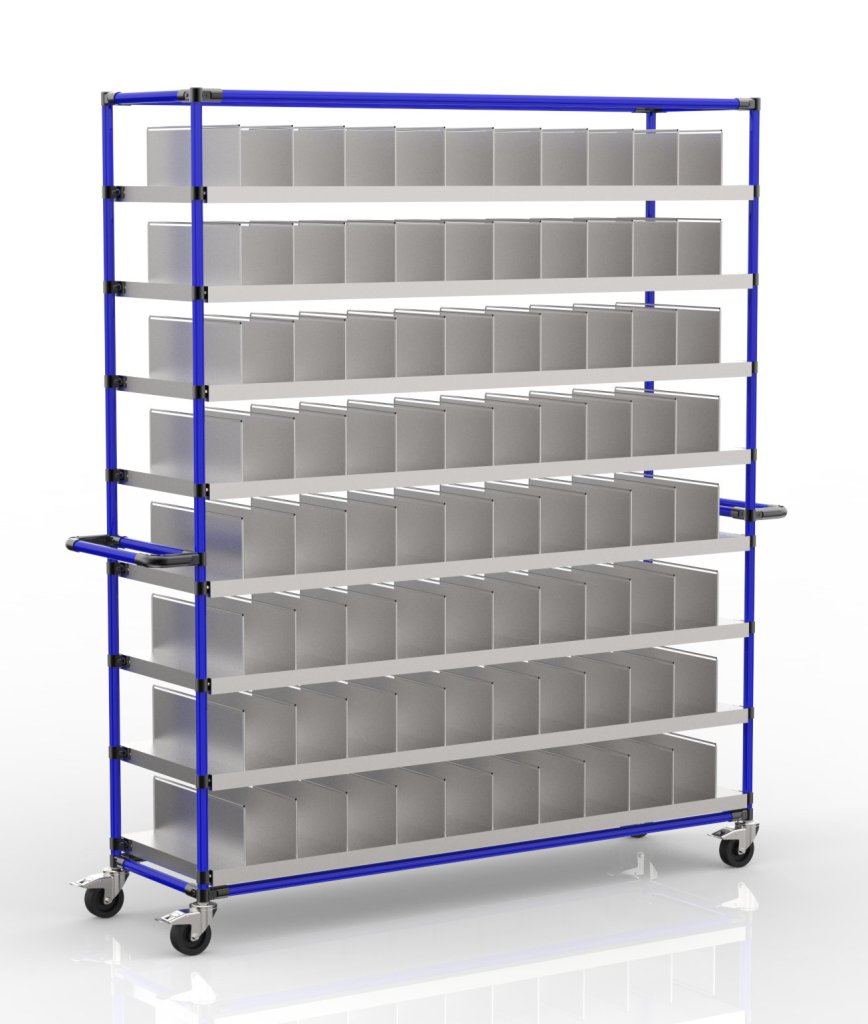 Transportwagen zum Transport verschiedener Teile ausgestattet mit einem modularen Teiler. Der Wagen verfügt über Blechregale mit vollständige Beschreibung und Parameter