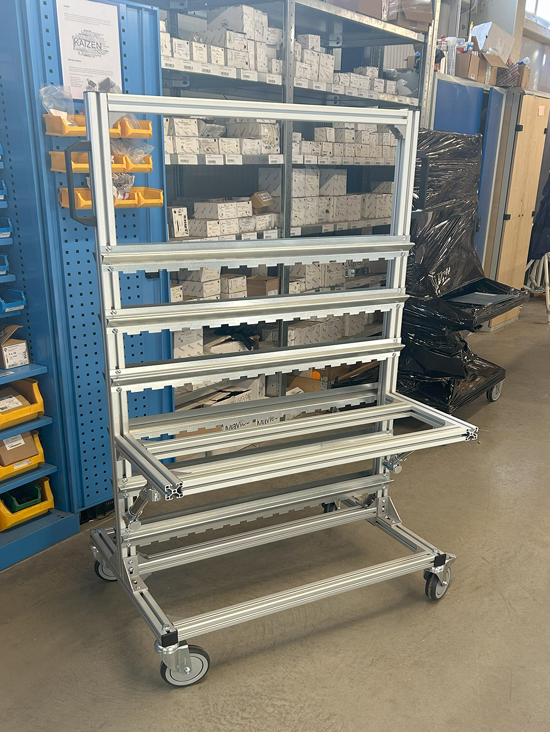 Der Wagen zum Aufhängen von KLT-Boxen ist ein praktischer Helfer für den Umgang mit Kisten und Materialien in industriellen Umgebungen. Der Wagen besteht aus Aluminiumprofilen, was nicht nur Festigkeit, sondern auch die Haltbarkeit der gesamten Konstruktion garantiert. Teil des Wagens ist auch ein ergonomischer schwarzer Griff, der eine bequeme Handhabung und einfache Steuerung des Wagens ermöglicht. Der Wagen ist mit 2 drehbaren Rädern mit Bremse und einem Durchmesser von 125 mm sowie 2 drehbaren Rädern ohne Bremse mit einem Durchmesser von 125 mm ausgestattet. Tragfähigkeit 400 kg. Abmessungen 1550 x 855 x 600 mm.