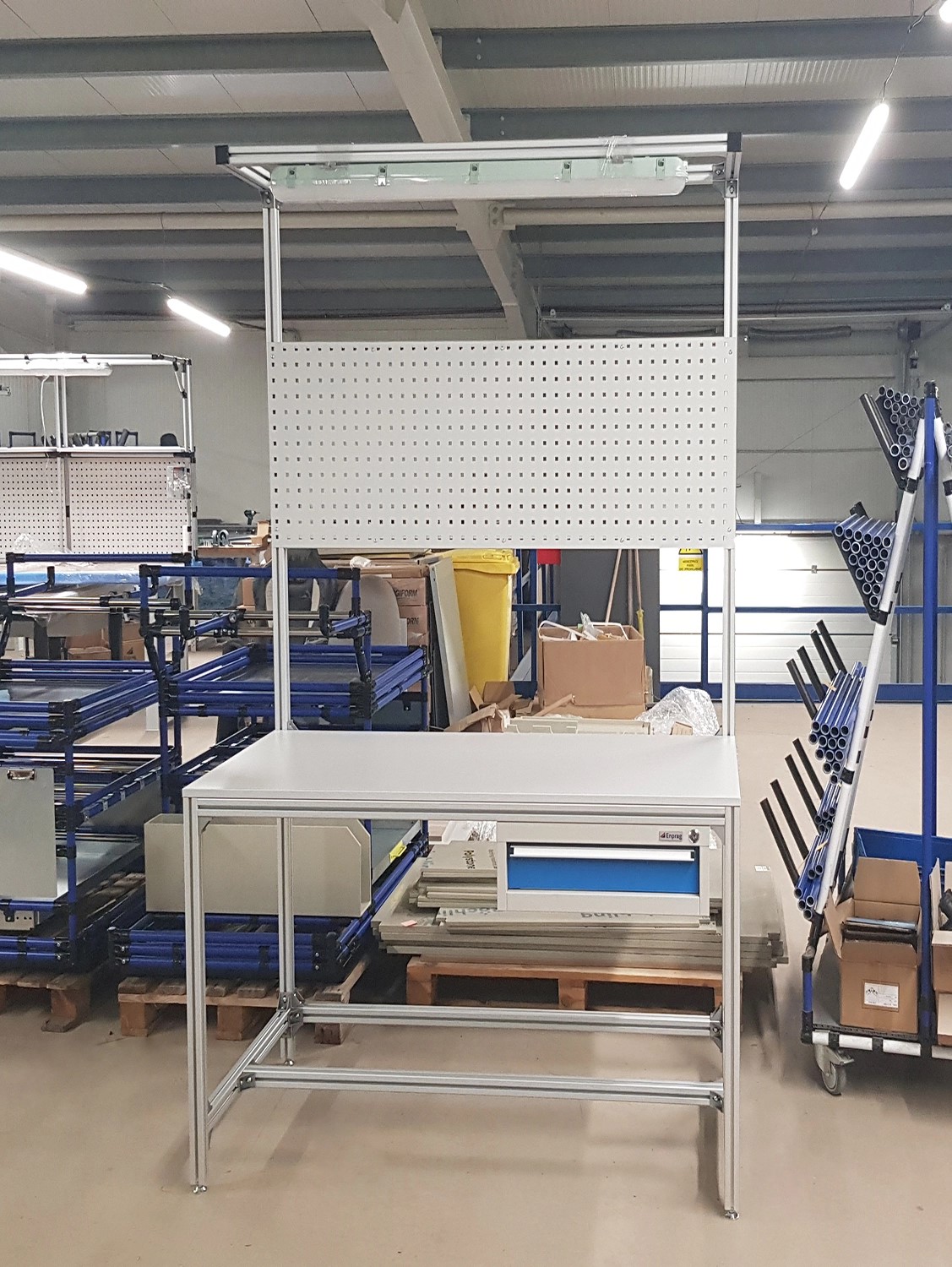 Werkbank aus Aluminiumprofilen mit Lochwand zur übersichtlichen Werkzeugaufbewahrung und LED-Beleuchtung — die ideale Lösung für Produktions-, Montage- und Servicearbeitsplätze.