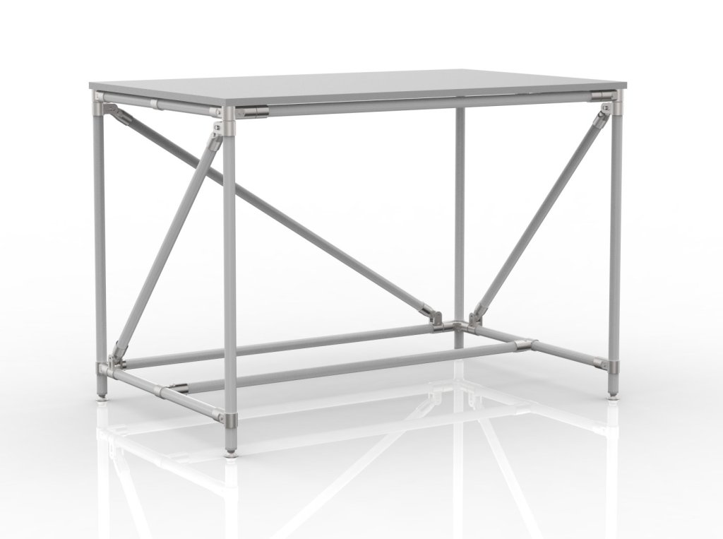 Werkbank aus einem Rohrbausatzsystem mit einer DTDL-Arbeitsplatte, 18 mm dick, einem Tischcontainer und vier höhenverstellbaren Füßen. Tragfähigkeit bei gleichmäßiger Lastverteilung 100 kg. Maße 850 x 2000 x 750 mm.
