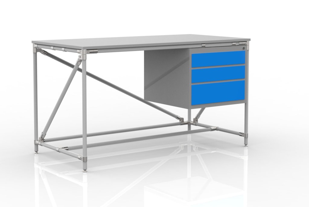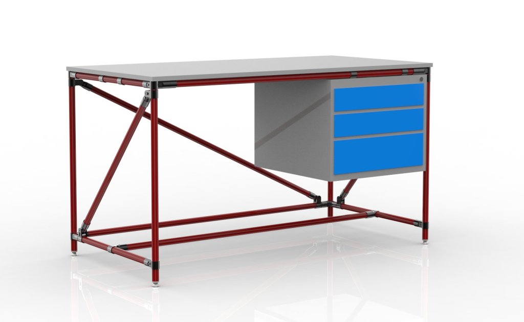 Werkbank aus einem Rohrbausatzsystem mit einer DTDL-Arbeitsplatte, 18 mm dick, einem Tischcontainer und vier höhenverstellbaren Füßen. Tragfähigkeit bei gleichmäßiger Lastverteilung 100 kg. Maße 850 x 2000 x 750 mm.