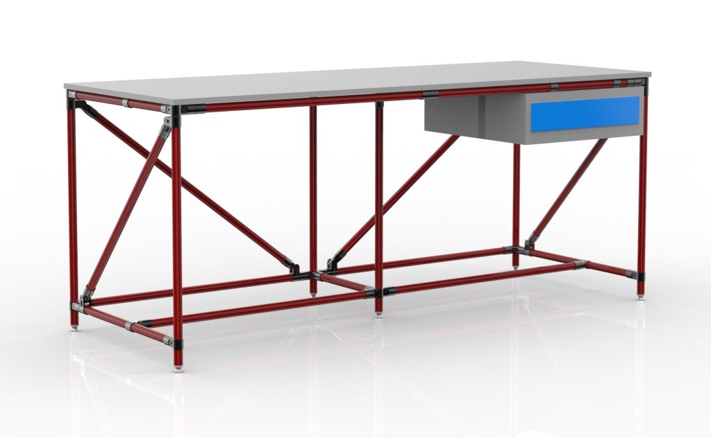 Werkbank aus einem Rohrbausatzsystem mit einer DTDL-Arbeitsplatte, 18 mm dick, einem Tischcontainer mit einer Schublade und vier höhenverstellbaren Füßen. Belastbarkeit bei gleichmäßiger Lastverteilung 100 kg. Maße 850 x 2000 x 750 mm.
