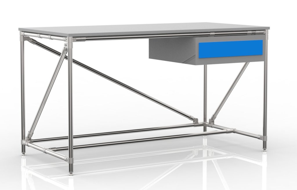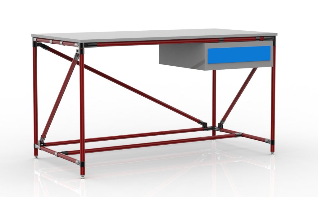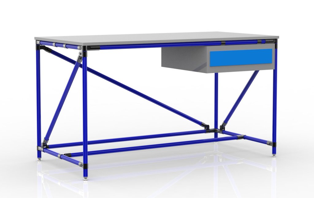 Werkbank aus einem Rohrbausatzsystem. Enthalten ist eine beidseitig laminierte Arbeitsplatte, ein Tischcontainer mit einer Schublade und vier höhenverstellbare Füße. Belastbarkeit bei gleichmäßiger Lastverteilung 100 kg. Maße 850 x 1500 x 750 mm.