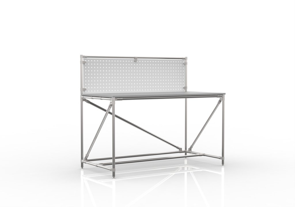 Werkbank aus einem Rohrbausatzsystem mit einem Perfopanel. Enthalten sind eine beidseitig laminierte Spanplatte, 18 mm dick, ein Perfopanel zur Aufbewahrung von Werkzeugen oder Boxen und vier höhenverstellbare Füße. Tragfähigkeit bei gleichmäßiger Lastverteilung 100 kg. Maße 1282 x 1500 x 750 mm.