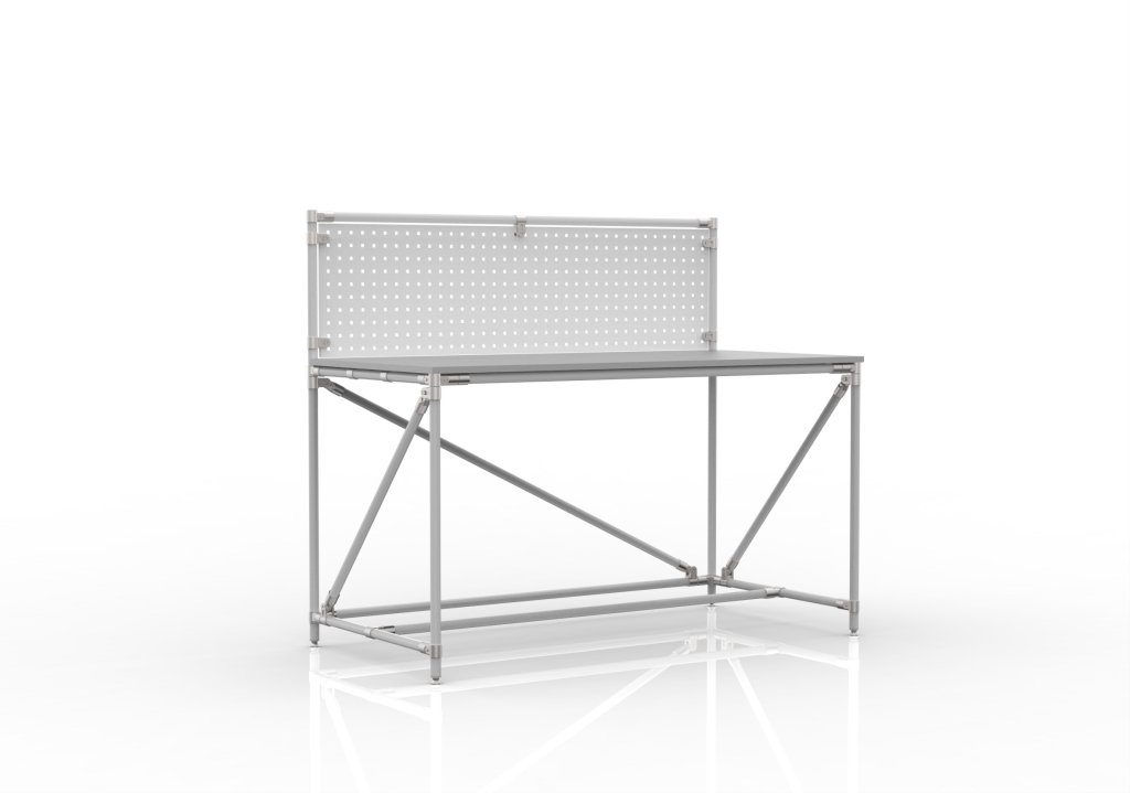 Werkbank aus einem Rohrbausatzsystem mit einem Perfopanel. Enthalten sind eine beidseitig laminierte Spanplatte, 18 mm dick, ein Perfopanel zur Aufbewahrung von Werkzeugen oder Boxen und vier höhenverstellbare Füße. Tragfähigkeit bei gleichmäßiger Lastverteilung 100 kg. Maße 1282 x 1500 x 750 mm.