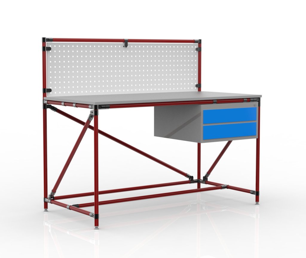 Werkbank mit Lochplatte aus dem Rohr-Baukastensystem. Der Tisch enthält eine beidseitig laminierte Spanplatte mit einer Dicke von 18 mm, einen Tischcontainer mit drei Schubladen, eine Lochplatte zur Aufhängung von Werkzeugen oder Kästen und vier verstellbare Füße. Tragfähigkeit bei gleichmäßiger Belastung von 100 kg. Abmessungen 1282 x 2000 x 750 mm.